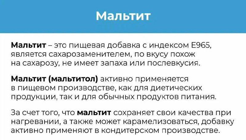 Мальтит Попадая в пищеварительный тракт, продукт очень медленно всасывается, постепенно расщепляясь до декстрозы, маннита и сорбита. ДЕКСТРОЗА ⤵️⤵️⤵️ https://t.me/c/1908422787/60