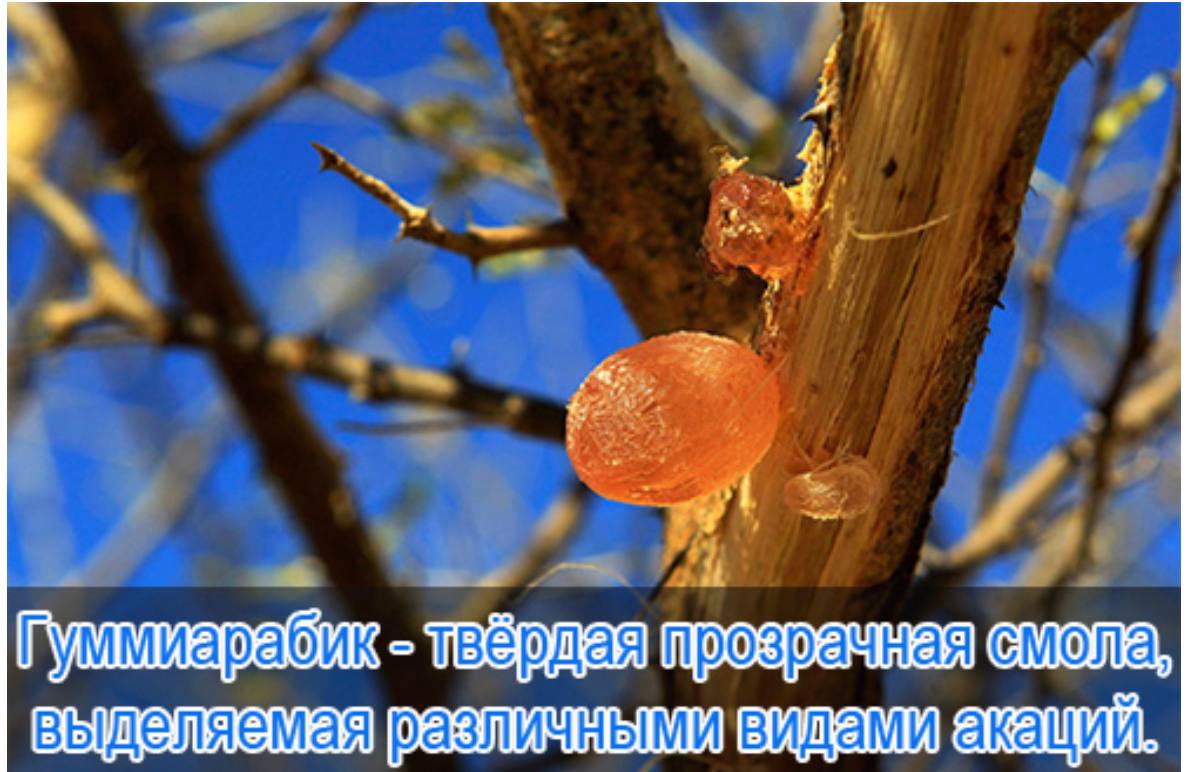 Гуммиарабиком (от латинских gummi – камедь и arabicus – аравийский) называют полисахарид природного происхождения, известный также как пищевая добавка с индексом Е414, входящая в группу стабилизаторов, загустителей, эмульгаторов. Гуммиарабик представляет собой прозрачную смолу акаций, которую собирают вручную (calorizator). Стволы акаций специальным образом надрезают, чтобы ускорить выделение смолы, затем вещество очищают методом рафинирования.