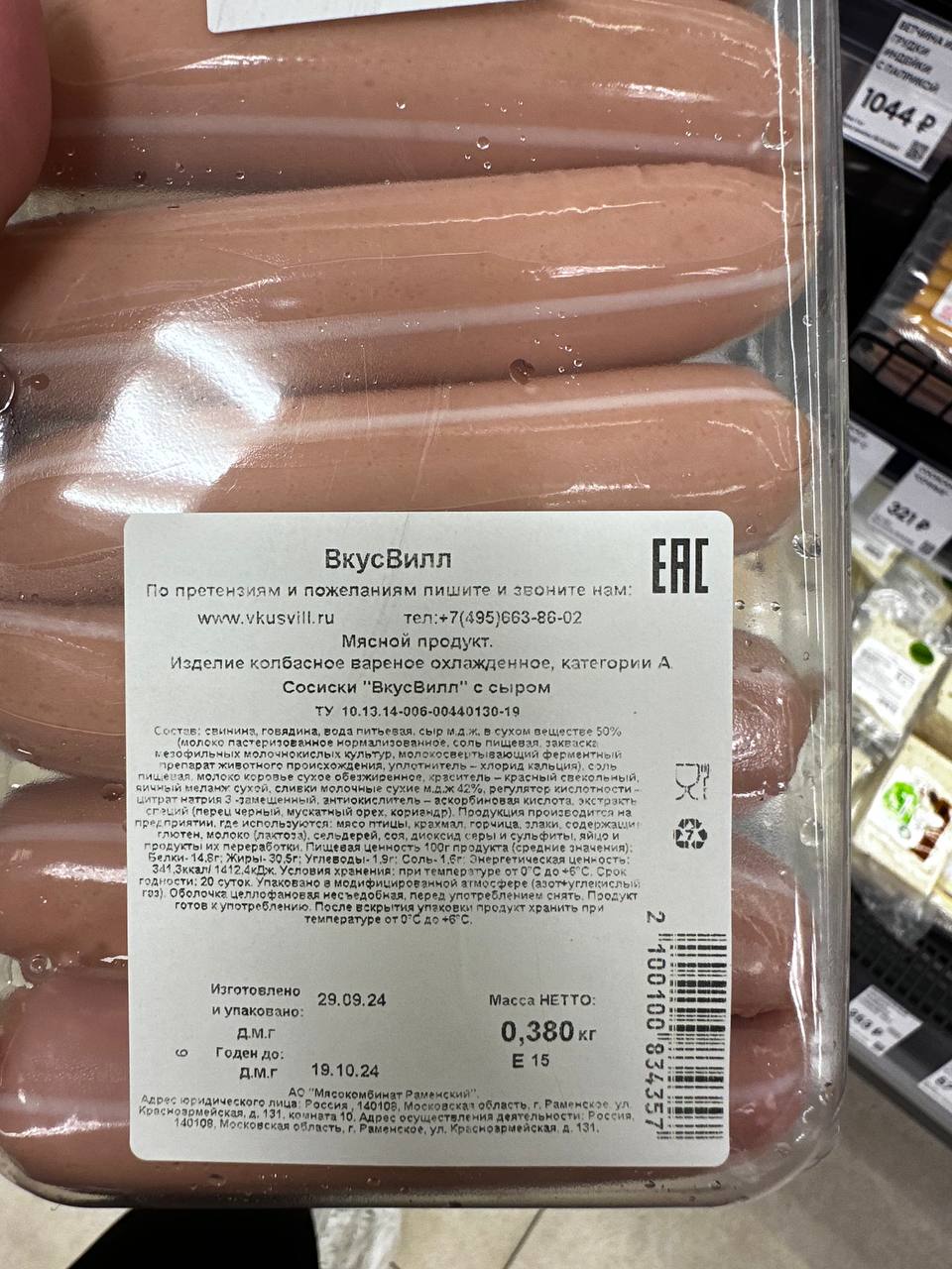 Сосиски с сыром ✳️молоко здесь в составе в основном из-за сыра. Я взяла их себе на пробу, очень вкусные, похожи на домашние, которые я делала сама Вкусвилл