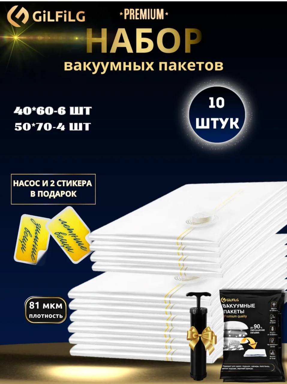 GiLFiLG Вакуумные пакеты для одежды и вещей Премиум класса 10 штук