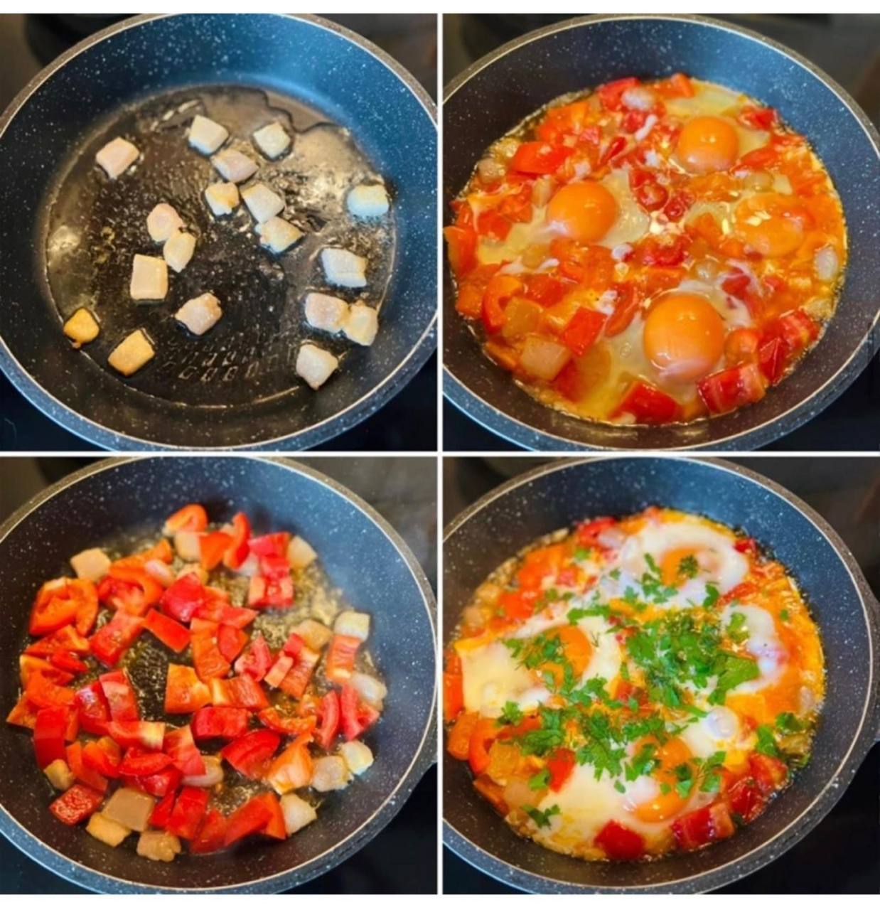 Тут и так понятно всё) жарим яичницу на сале. Добавляем помидоры, перец и зелень ✅ #основа