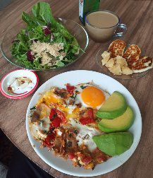 2 приема с БАДами: 1.яичница + бекон, зелень, халуми, пармезан, кофе 2.котлета, запеканка мясная с грибами и сыром, зелень, электролиты