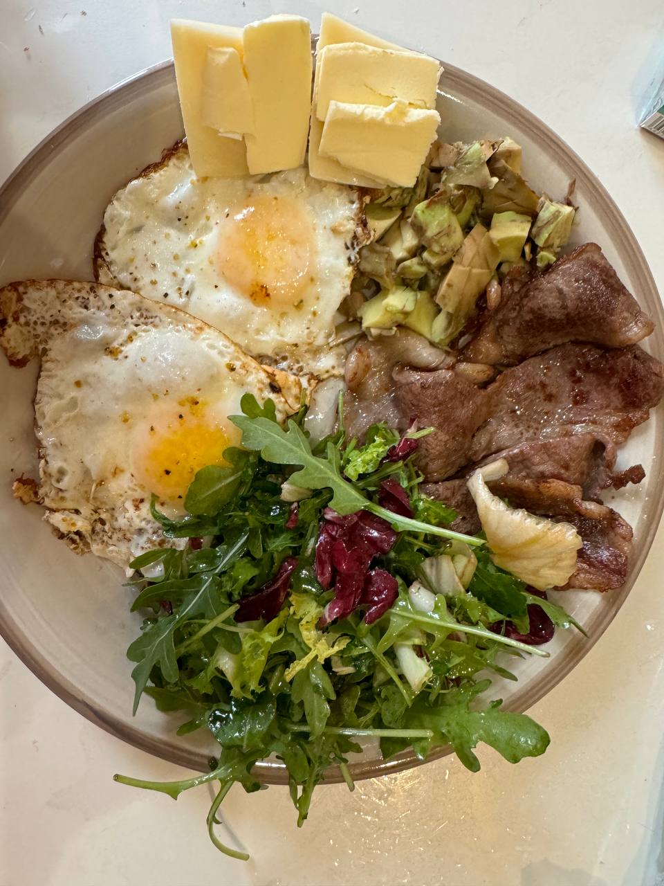 Бекон из мраморной говядины , яйца на масле гхи, авокадо , пармезан , сливочное масло ) ЯУ с Боржоми) по ощущениям , что на сегодня больше не влезет .