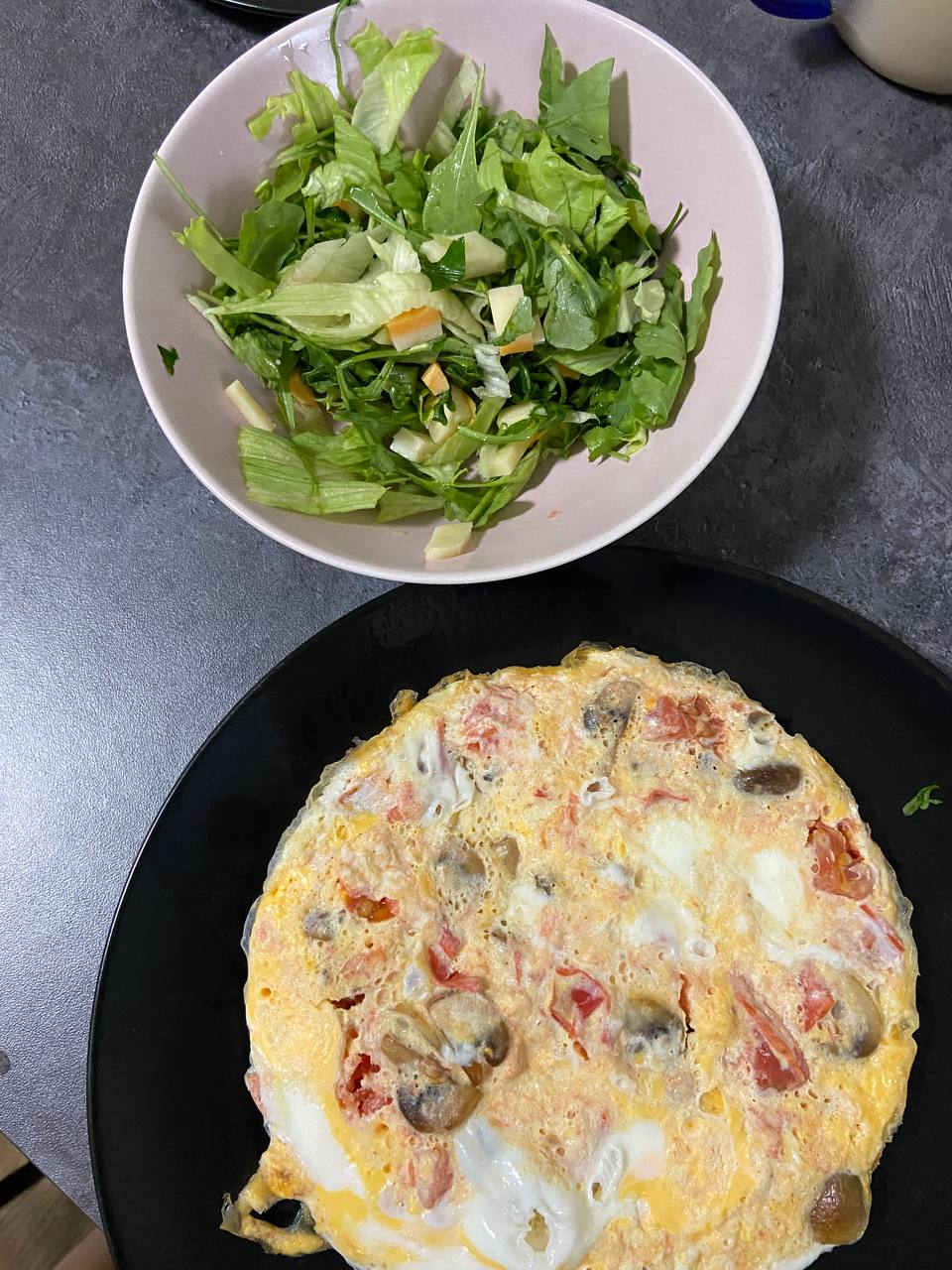 Добрый вечер! Завтрак омлет с овощами и салат с авокадо. Обед забыла сфотографировать. Запечённая свинина в сливках с сыром с тем же салатом. На ужин будут кето бургеры с квашеной капустой. Все бады выпила.