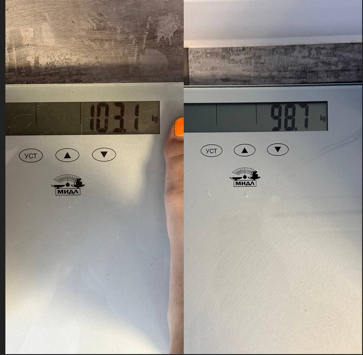 За 2 недели минус 4,4 (было 103,1/сейчас 98,7) в первую неделю ушло 2,9 кг, во вторую 1,5 кг.