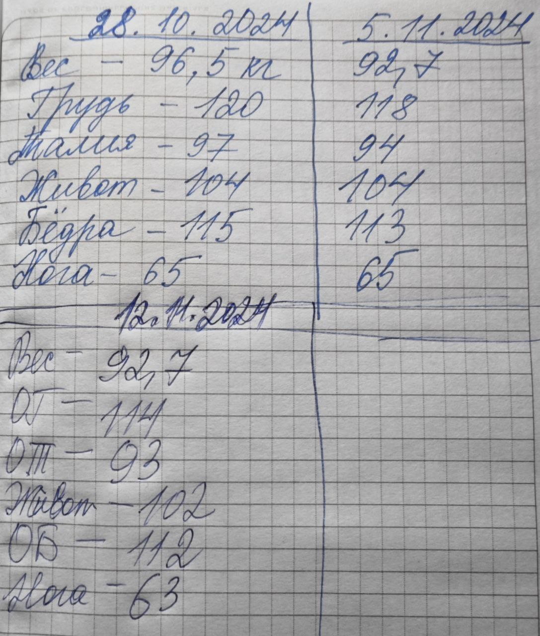 У меня нет изменений по весу с прошлого раза, но вроде как есть изменения по сантиметрам. Надеюсь, дело не в том, что я криворукая и неправильно пользуюсь мерной лентой))