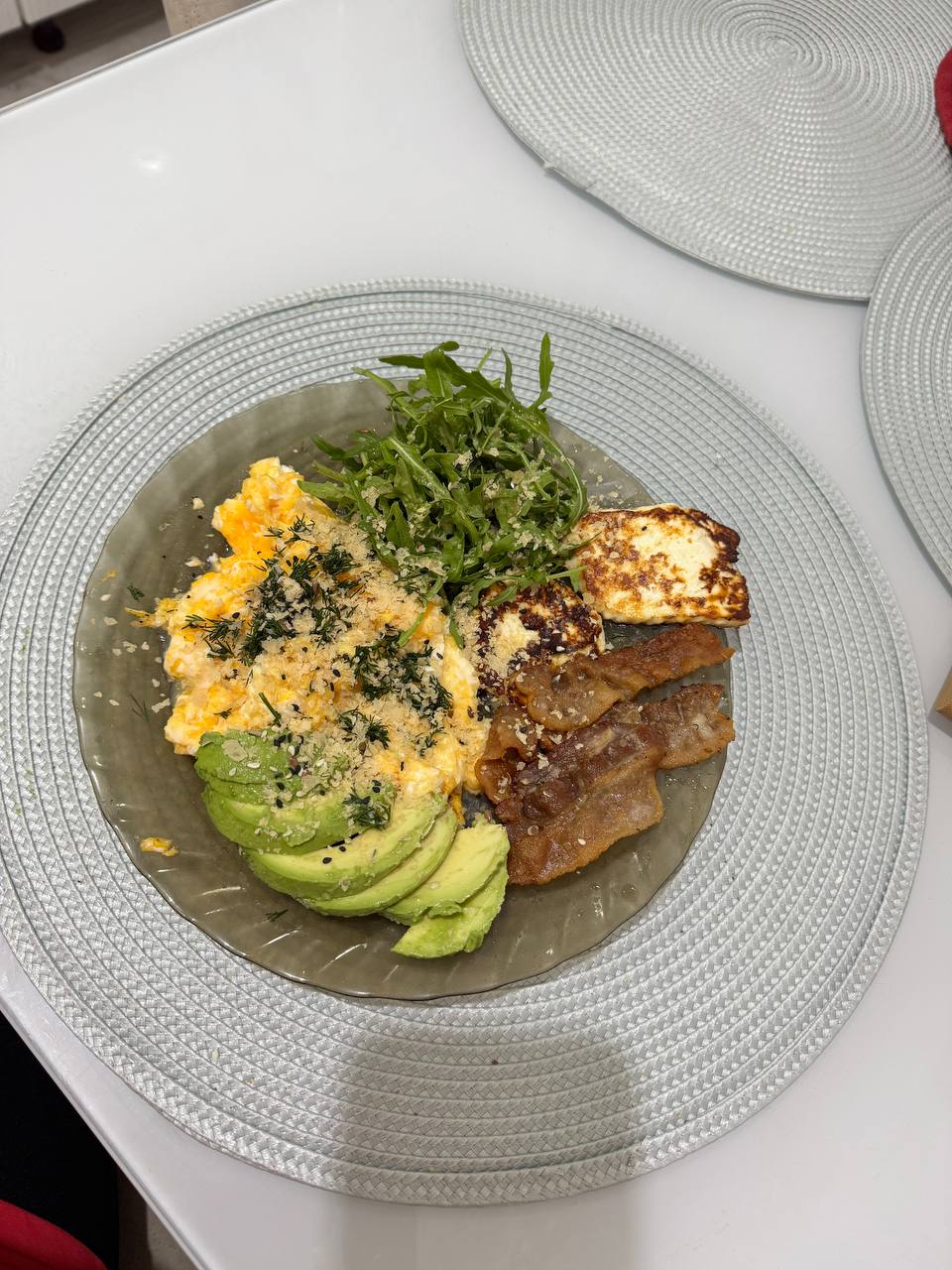 Завтрак в 8:30 : 3 яйца на топлении масле, 1/2авокадо, рукола брызнула олив.маслом, бекон 2слайса, сыр адыгейский обжарила, семена и дрожжи сверху, черный кофе