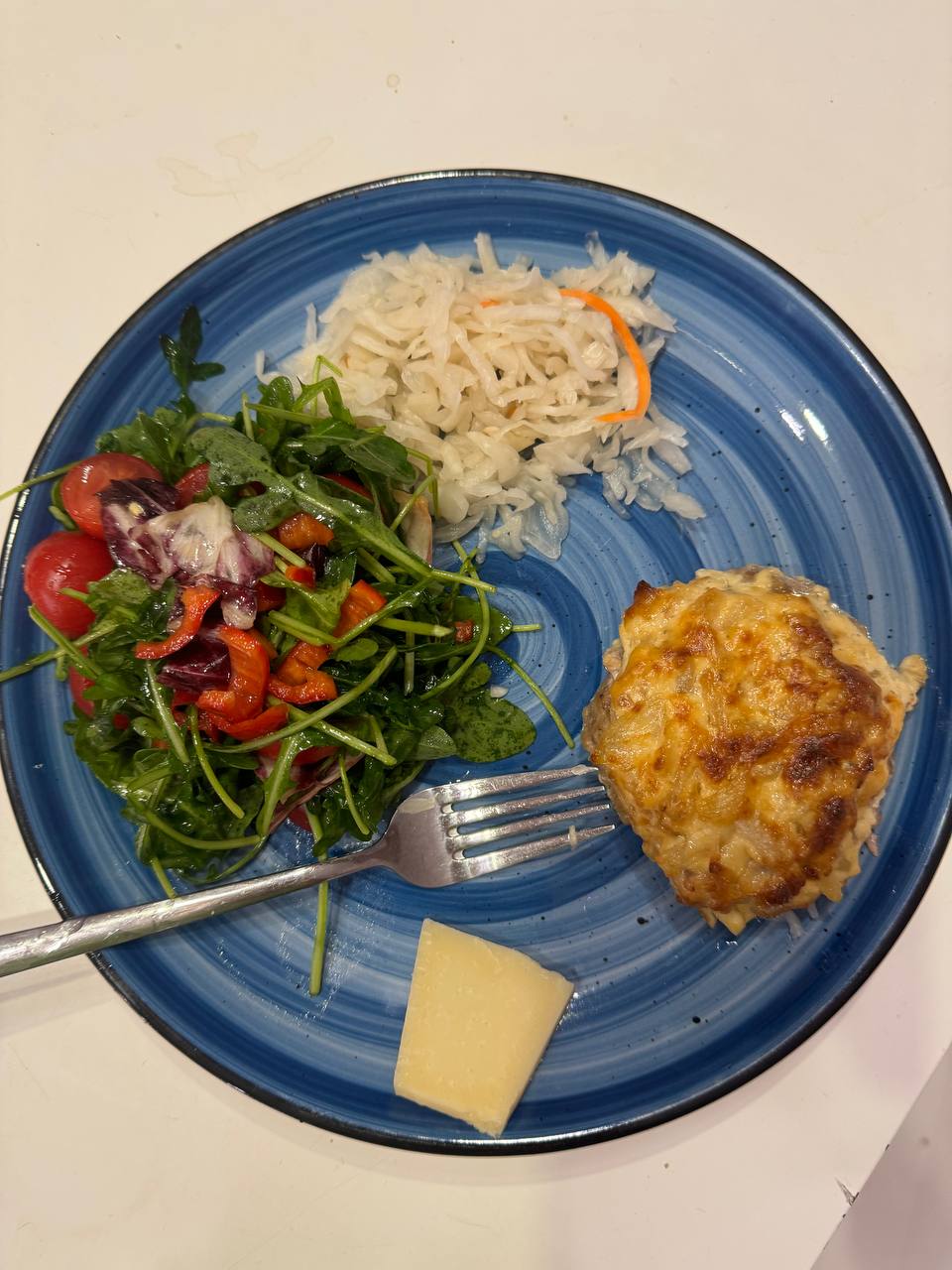 2 кетобургера, салат из рукколы, черри и перца с оливковым маслом, квашеная капуста и сыр