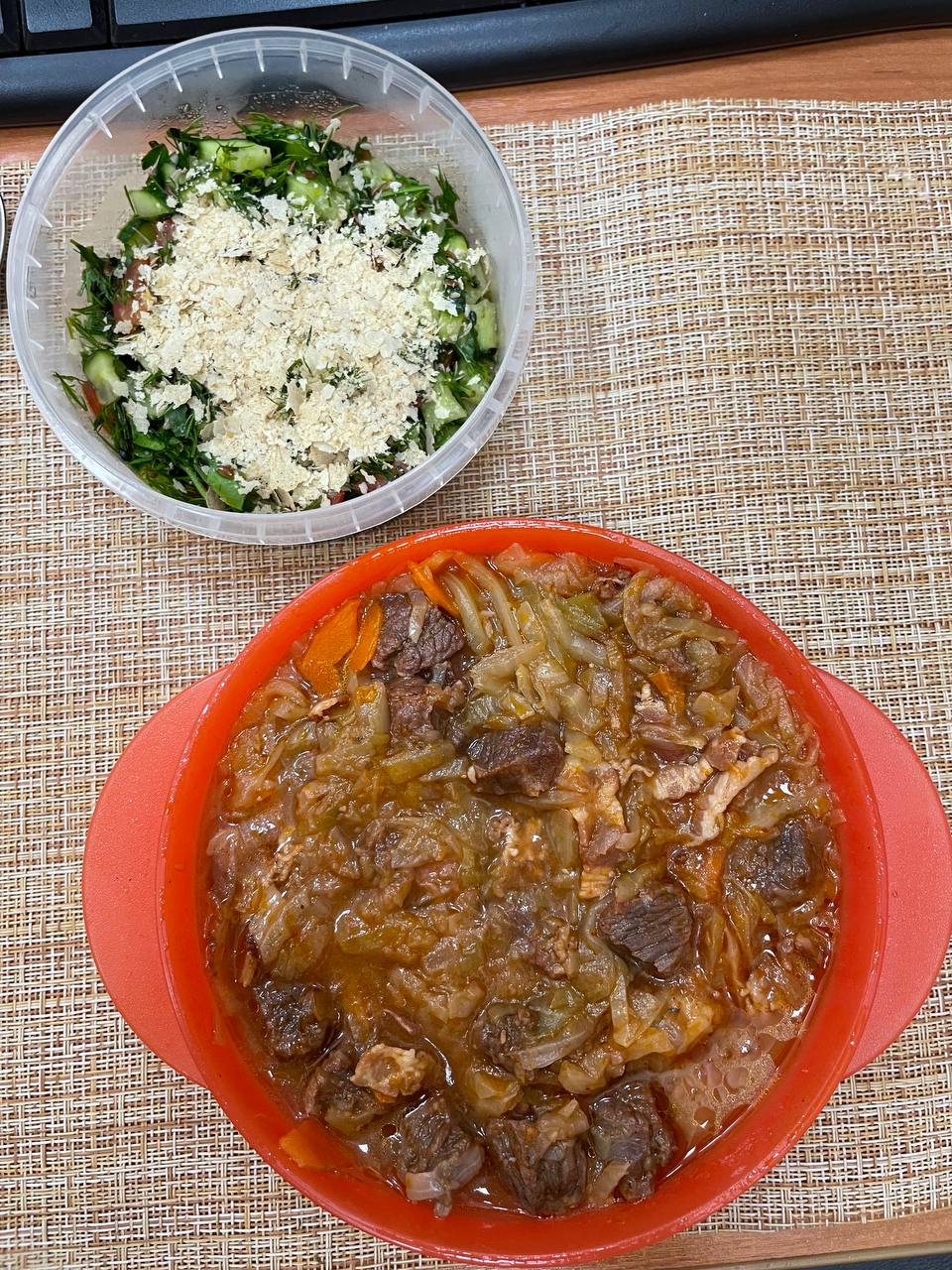 В вытопоенный жир из бекона добавлена капуста, лук, морковь, говядина, специи, розовая соль в скороварке потушено. Салат: укроп, петрушка, руккола, огурец, помидор бейби, масло овакода ВВ, семечки, дрожжи, розовая соль. 4 капсулы калия КЗ, утром расторопша, днем минералка.