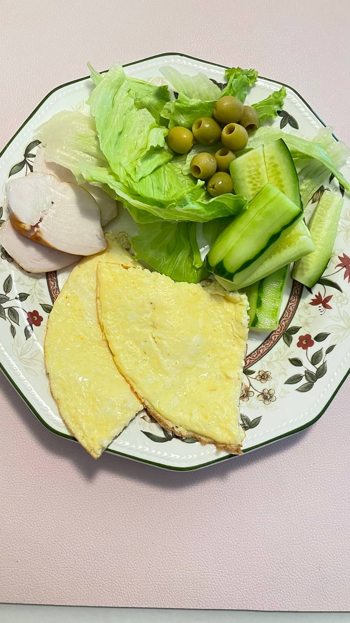 1. Омлет 3🥚+сливки+моцарелла+ куриное филе.Кофе со сливками и ложка десертная арахисовой пасты.