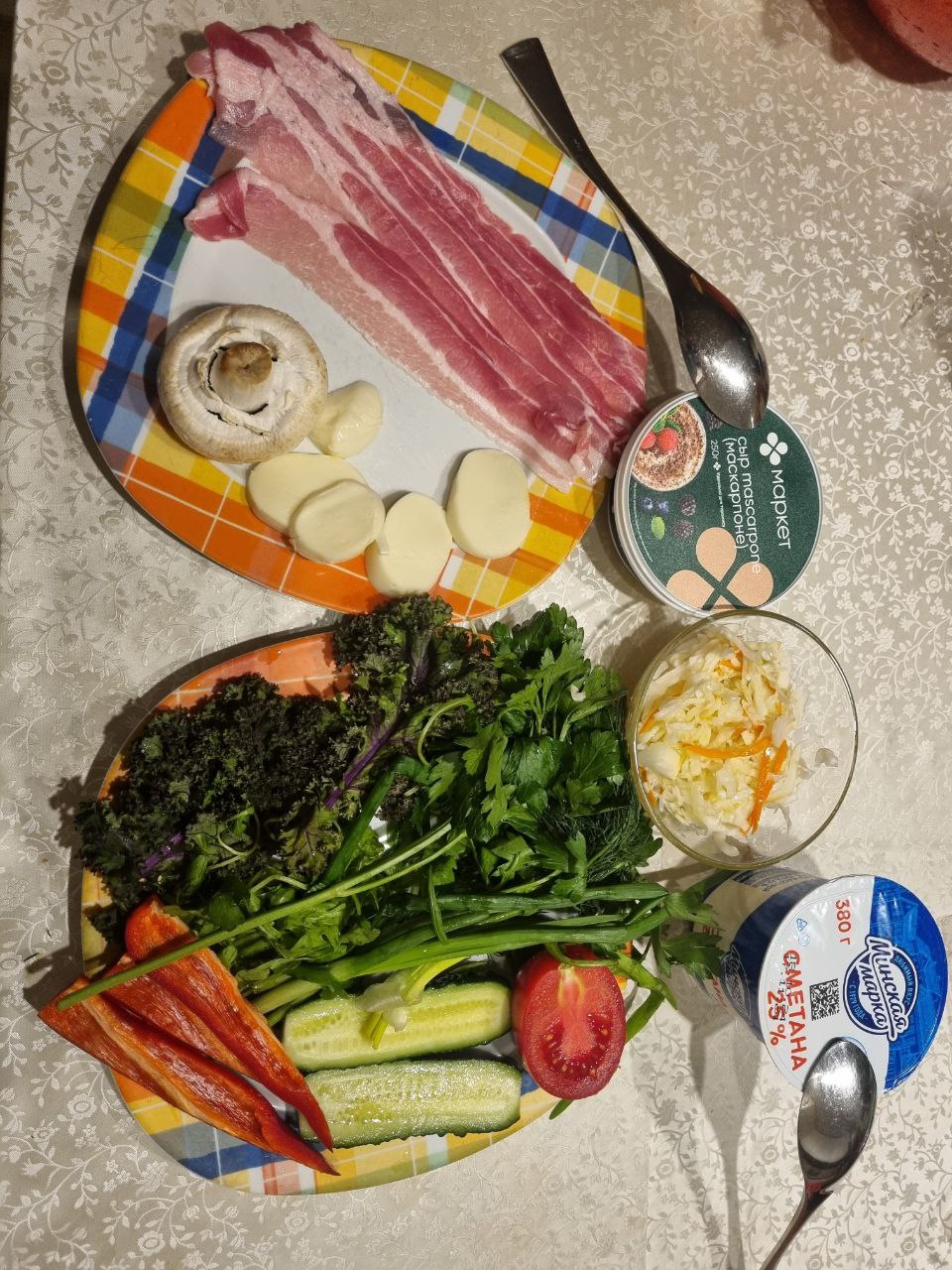 Мои продукты для вчерашнего ужина. Шампиньон и бекон поджарила на сале. Салат со столовой ложкой сметаны 25%. Маскарпоне - 1 ст.л.