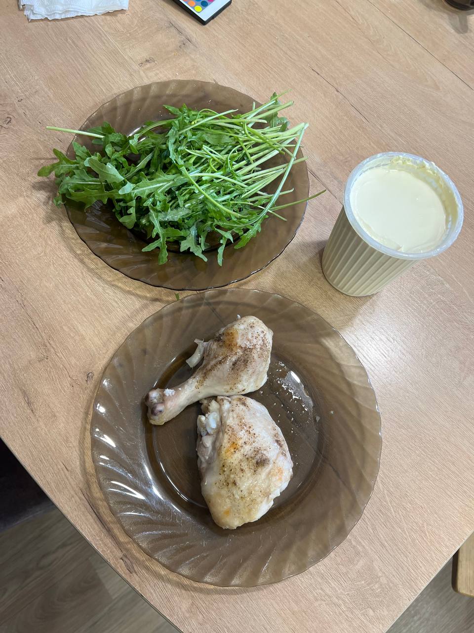 Курица (при запекании сверху положила по кусочку масла сливочного) Руккола Сливки домашние( сколько по жирности не знаю, по вкусу почти сливочное масло)