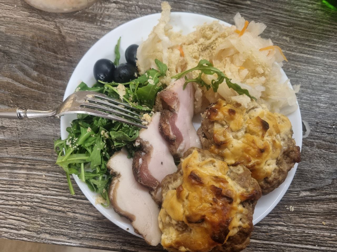 Ужин: 3 кето бургера, сало солёное , капуста квашеная, маслины, руккола, дрожжи пищевые + магний перед сном 5 капсул