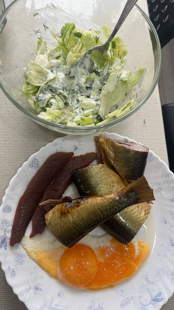 Здравствуйте, девочки! Салат: огурец, петрушка, укроп, айсберг, сметана 20проц Сельдь (состав сельдь и соль) 2 жаренных на масле желтка (белки от яиц не ем, не могу, в любом виде вызывают рвоту). У меня омад, мне комфортно так