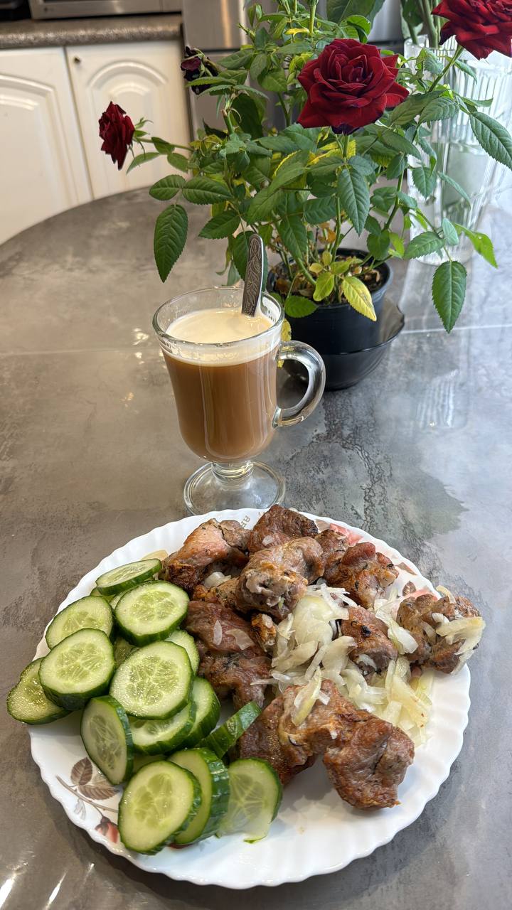 Добрый день! 1прием : шашлык свиной с огурчиками😋кофе зерновой со сливками 20%