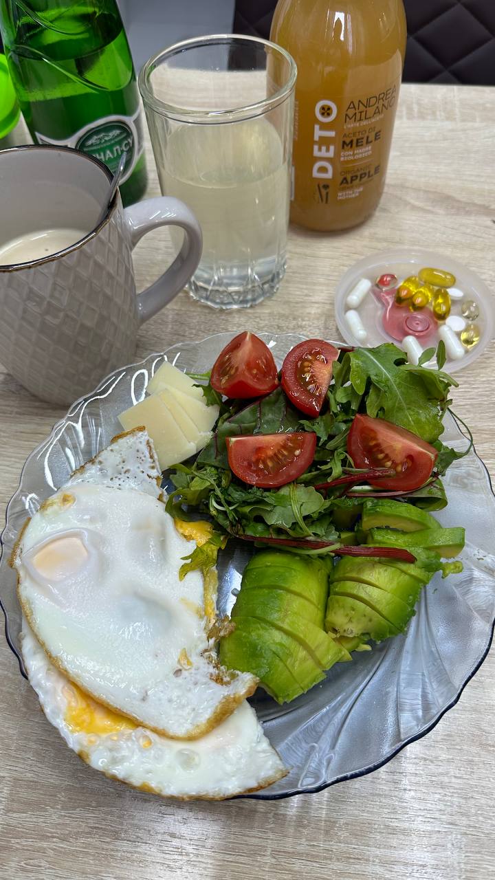 1пп 12:00 - 2 яйца, авокадо средний, зелень, 1 маленькая помидорка, сыр, были еще дрожжи, кофе со сливками 33%