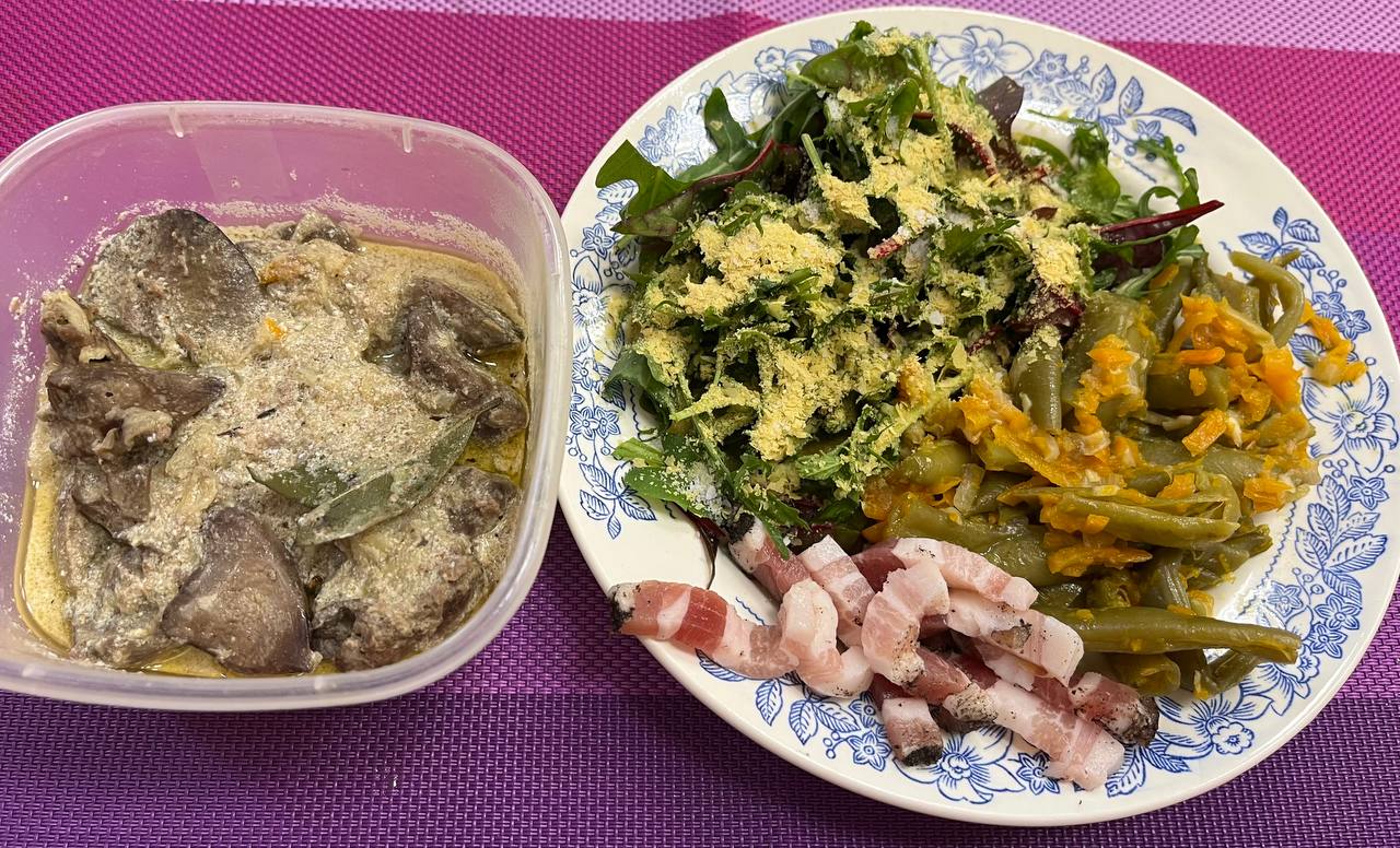 Омад. Печень с луком в сметане , зелень, стручковая фасоль, сало