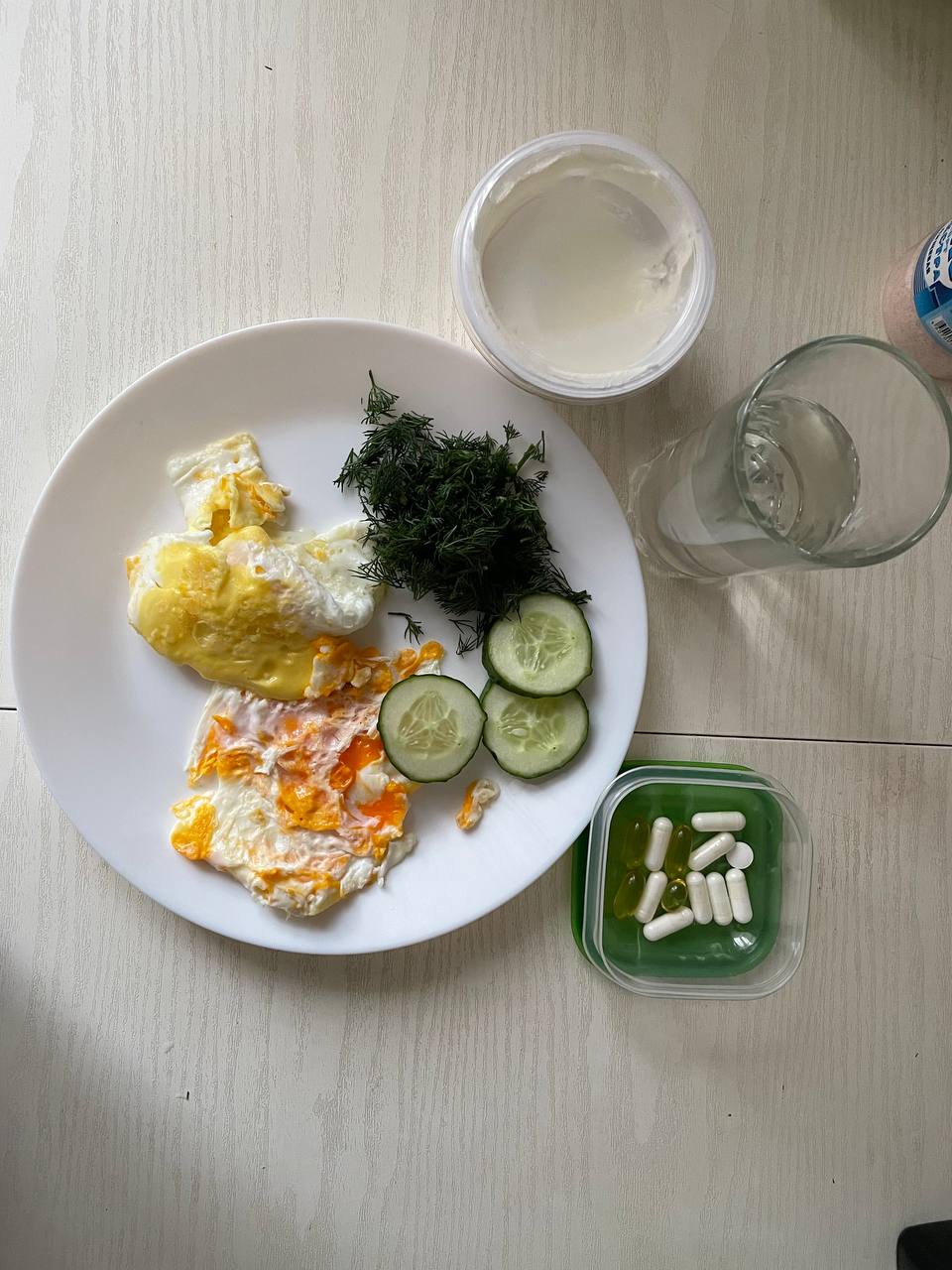 Добрый день! Отчёт за вчера- завтрак: яичница, укроп, огурец, сметана-30%, добавки. Обед: свинина, жарен на сале, капуста цветная, укроп,лук, огурец в сметане. Ужин-котлеты-только фарш хека, масло сливочное,капуста цветная, перец красный,укроп