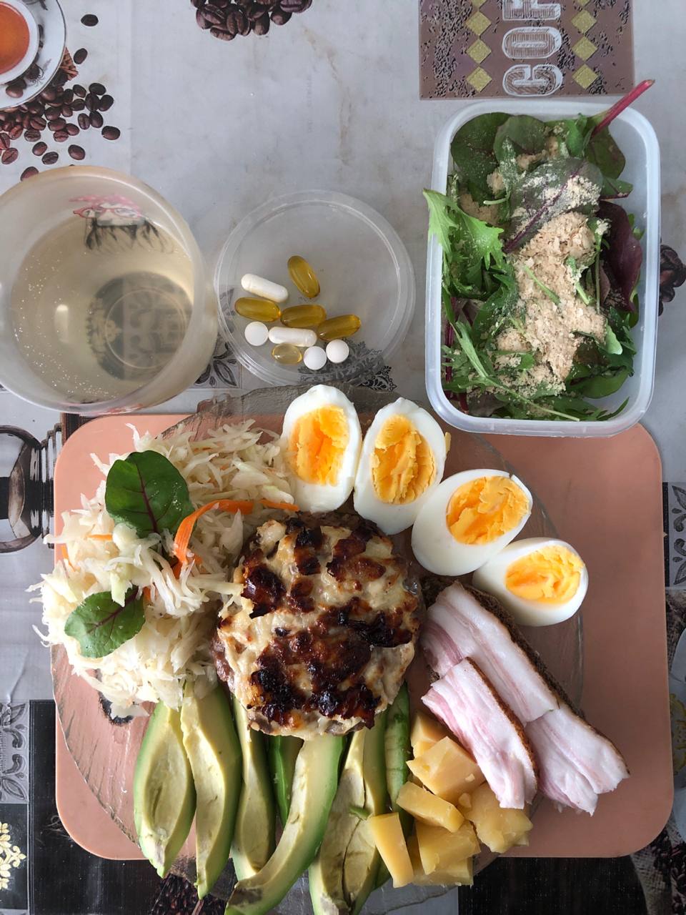 Утром кофе со сливками 33% , электролит. На обед эта тарелочка и бады сет1
