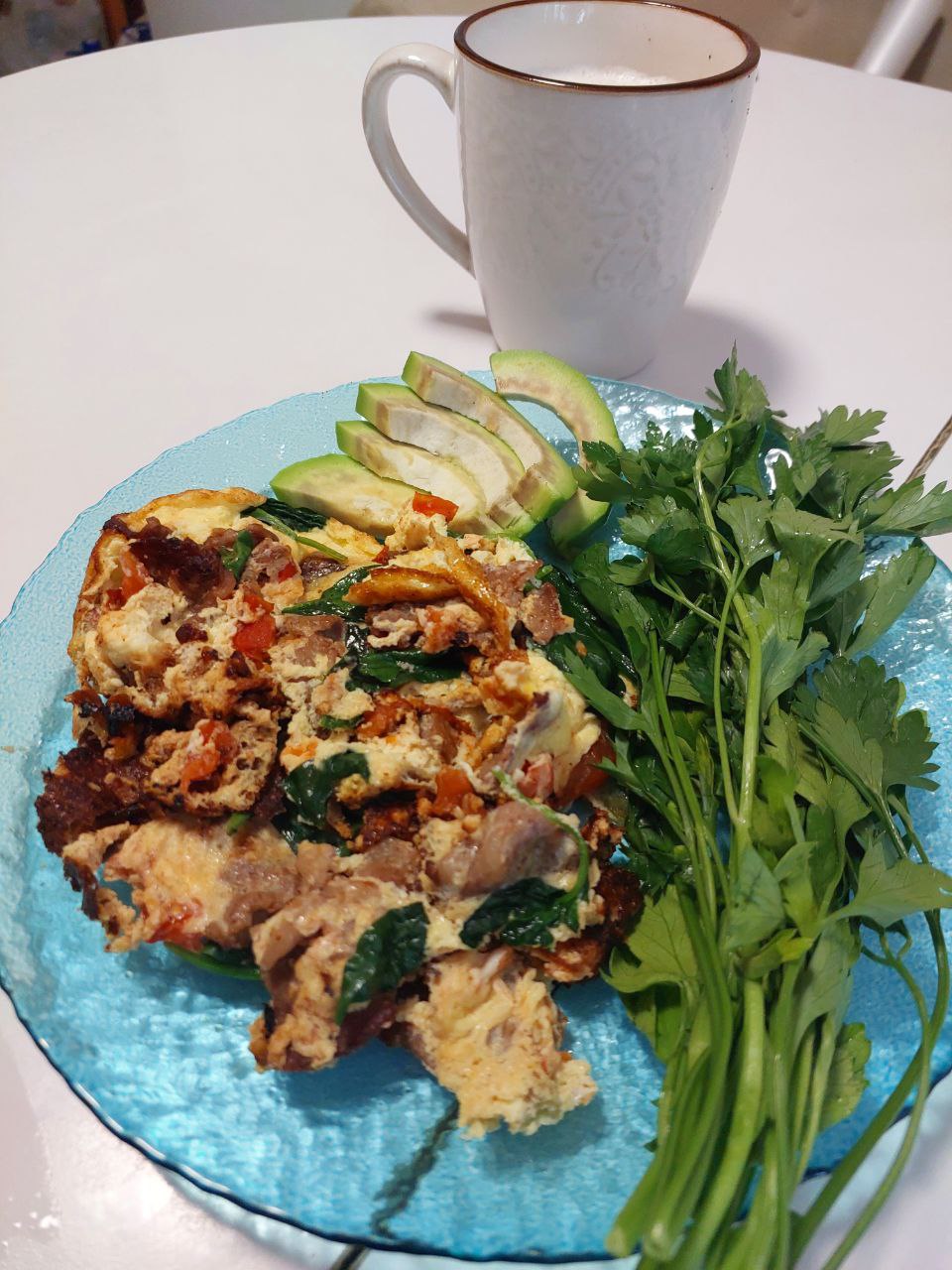 Утром шрот,в 11.30 завтрак или обед,за полчаса яу.Омлет с беконом и помидоркой с тремя ложками 33% сливок,пучок петрушки и чуток авокадо,кофе со сливками и чуток сахзама.Получилось сладко,не допила,не мое.На ужин салат-огурец,помидор,петрушка,укроп и вчерашний бургер.Салат посылала дрожжами.Перед ужином выпила яу.В перерывах пью кофе чёрный или чай зелёный.
