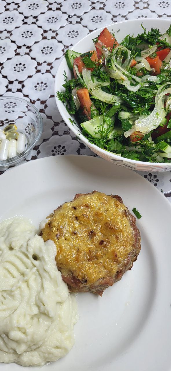 Салат (огурец+помидор+зелень+лук+масло олив.) Кето бургер Пюре из цветной капусты