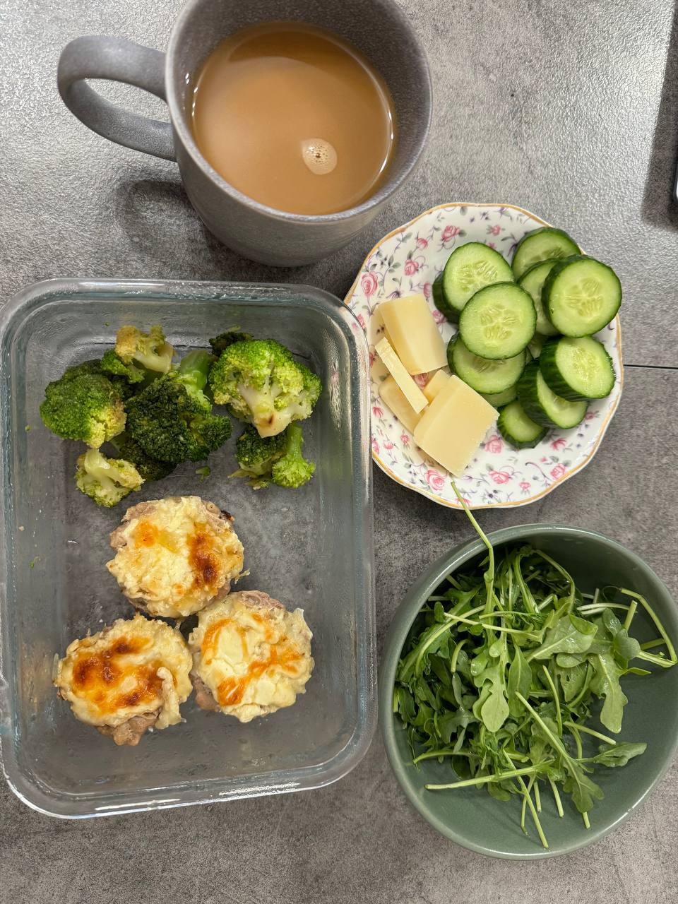 Добрый вечер! На завтрак кето-бургеры, овощи, зелень, немного пармезана, кофе со сливками 33%.