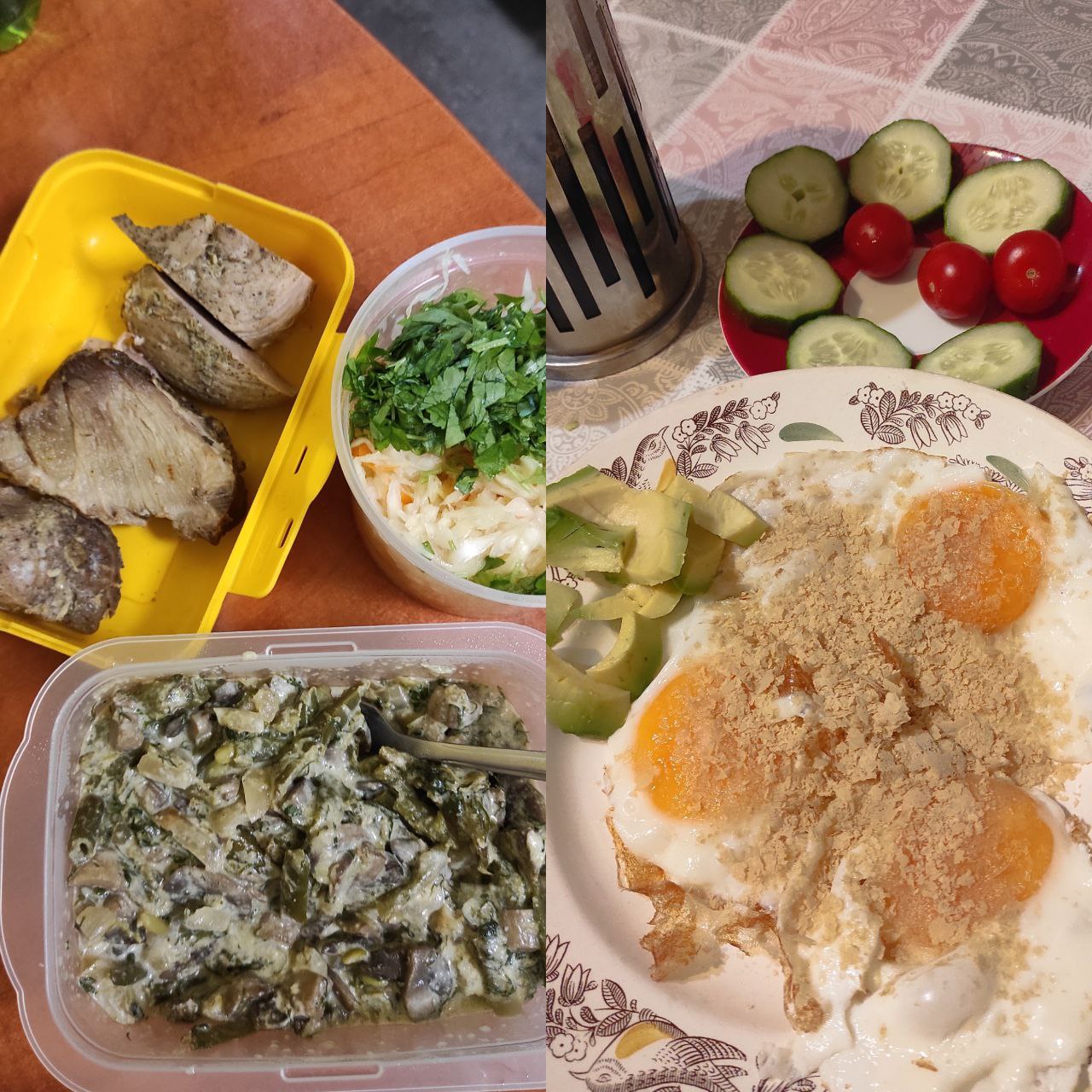 В 7.10 - 3 яйца на слив. масле, пол авокадо, дрожжи, огур, помид. Кофе со слив, маслом, 1ч.л творож сыра pretto.
