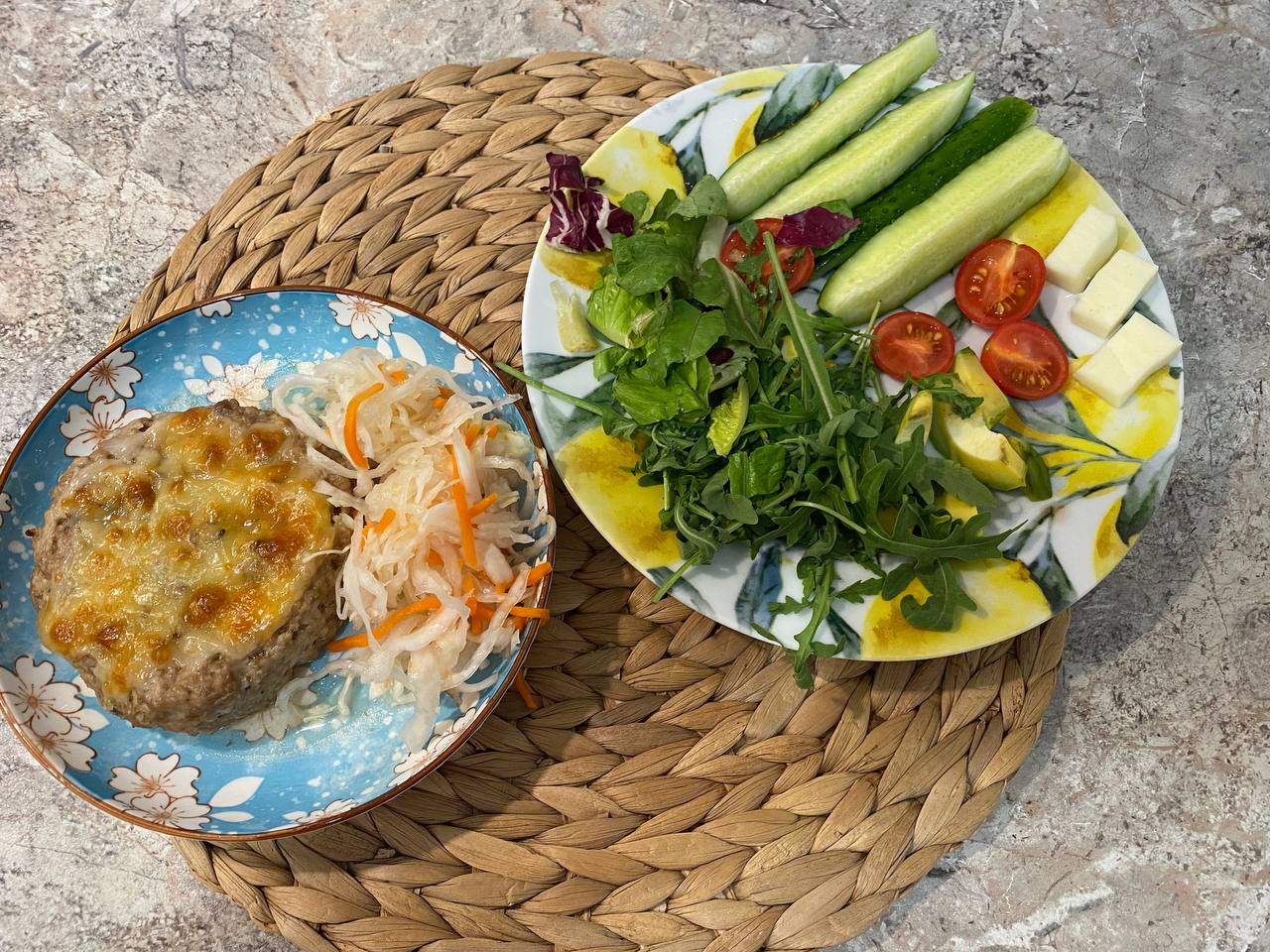 Обед: кетобургер с грибами и сыром, капуста квашеная с морковью, руккола и микс салата, сыр сулугуни, 1/4 авокадо, огурец и пару черри
