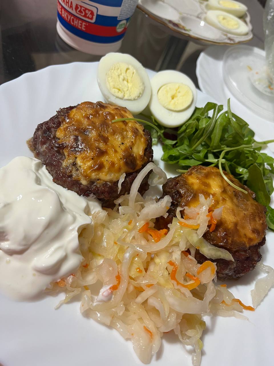 Завтрак , яйца с беконом шпинатом , кв капустой пару кусков буженины домашней . Ужин кето бургеры , яйцо руккола капуста , Сметана