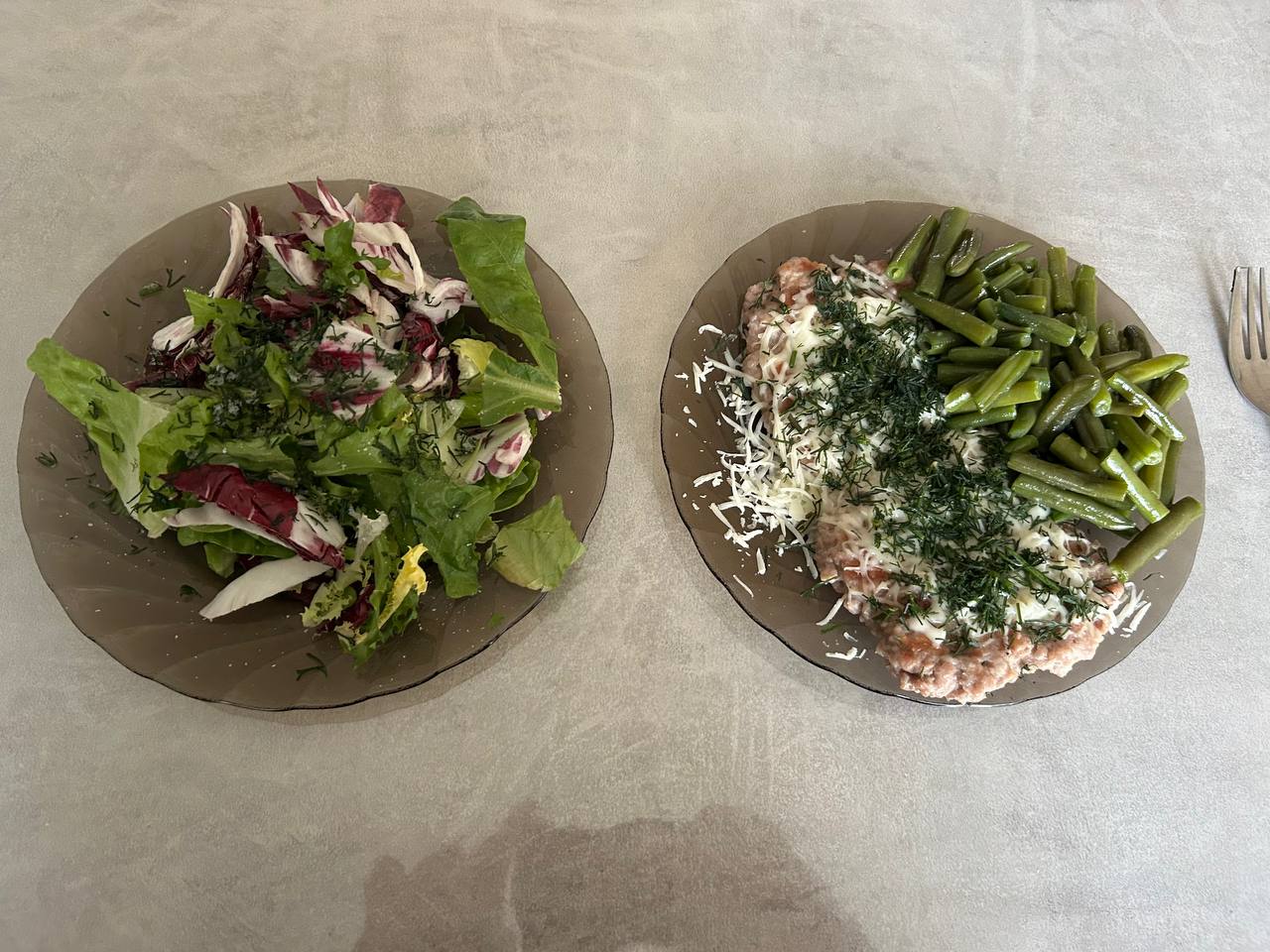 Обед: смесь зелени, укроп, жареная котлета из свинины на гриле, сверху моцарелла, фасоль стручковая. Ужин : бекон на гриле, кабачки на гриле, шампиньоны со сметаной и сыром в духовке.