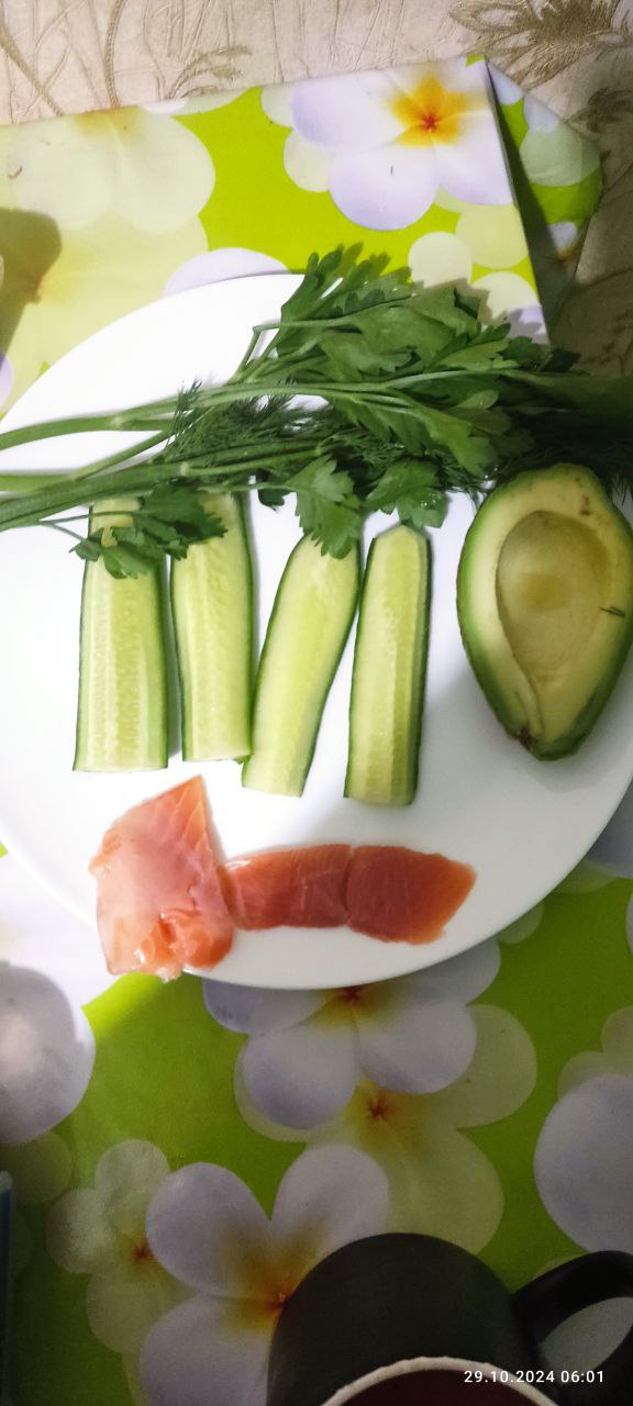 1. Огурец, авокадо, зелень,ко рыбка,чай зелёный