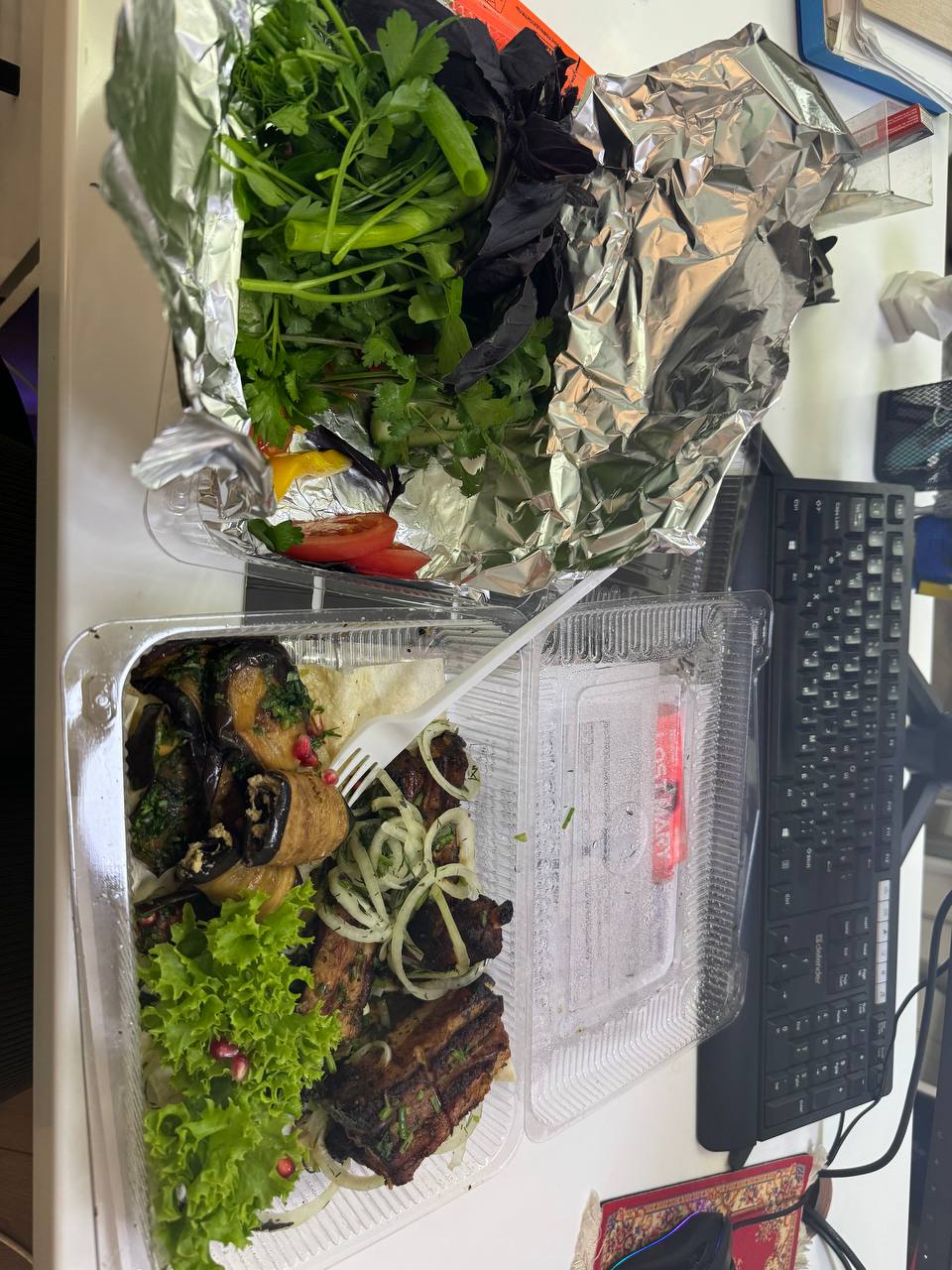 Добрый вечер! Один прием пищи сейчас. Ребра на гриле,баклажаны рулеты (состав орехи и зелень),овощи и зелень. Прям подсела на шашлык😁