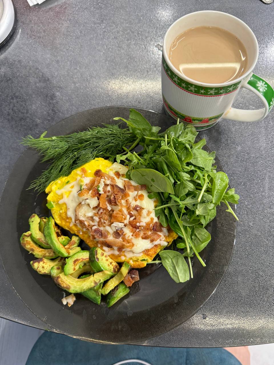 Омлет из 3-х маленьких деревенских яиц, 1 ст ложка сливок 33%, жарила на масле после двух полосок бекона, кружок моцареллы, 1/2 жаренного авокадо, зелень.