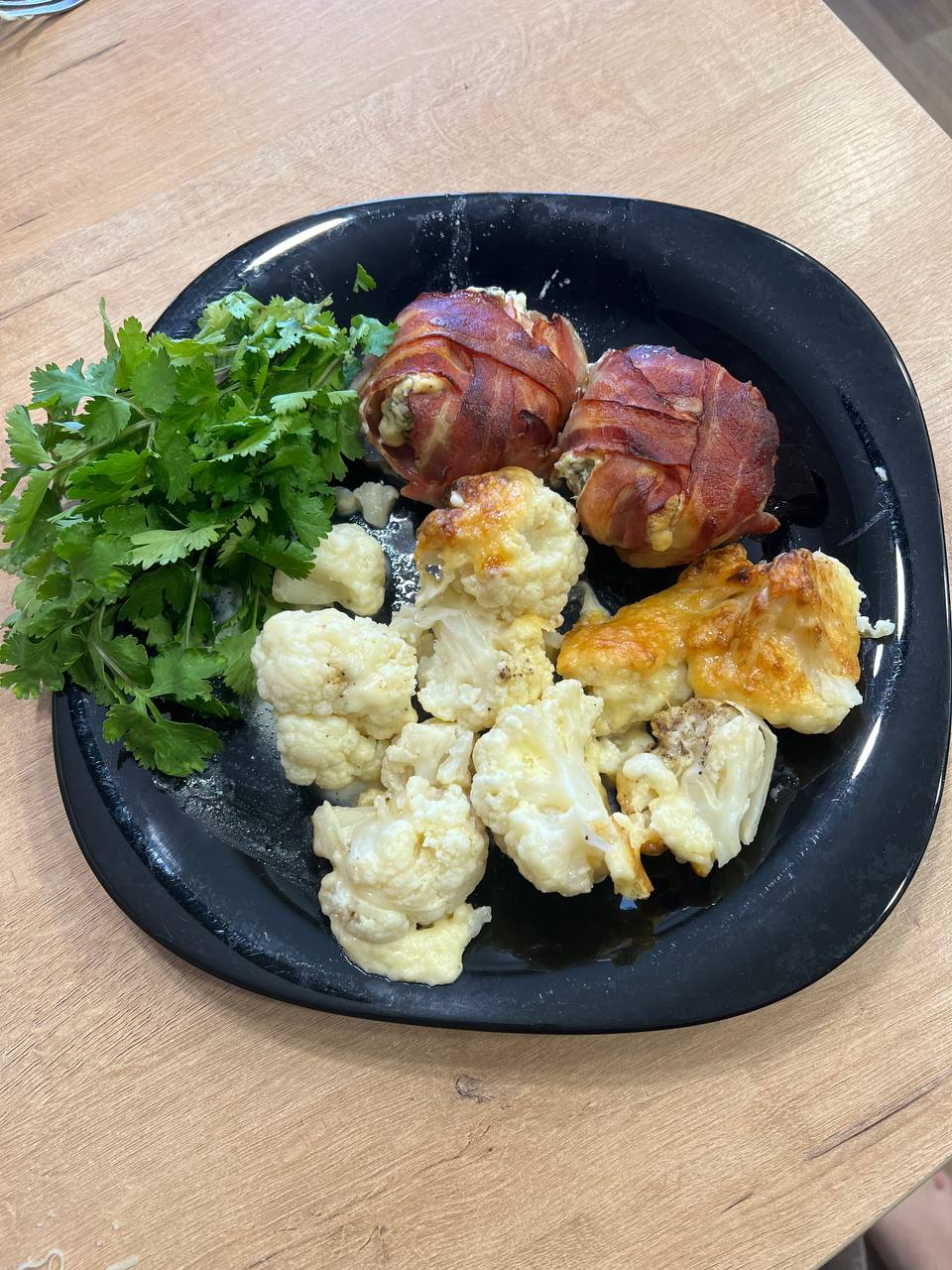 Капуста цветная запеченная со сливками, маслом сливочным и тертым сыром, грибы с творожным сыром и зеленью в беконе, кинза.