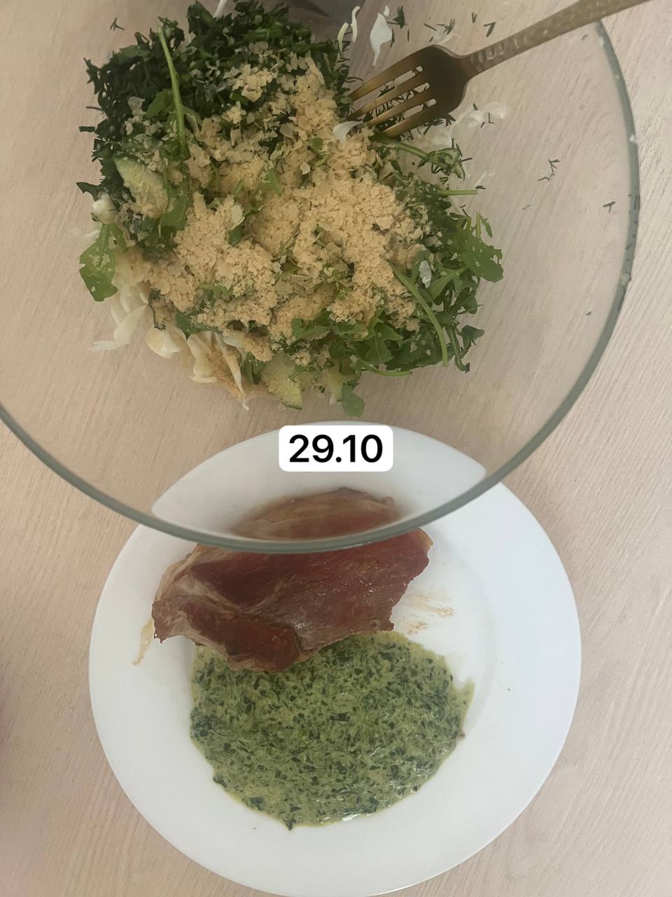 Вчерашняя тарелка: салат (капуста, дрожжи, чуть огурца, петрушка, укроп, руккола, оливковое масло, много роз.соли и две ложки дрожжей (они просто бесподобные, хочется добавить во все, что можно) + шпинатно-сливочный соус (масло, сыр, сливки жирные) + 2 стейка свинины, одним не наелась, требовалось еще - поэтому второй не сфотографировала. Все добавки принимаю, воду соленую употребляю, с уксусом пока подружиться не могу, но пью.