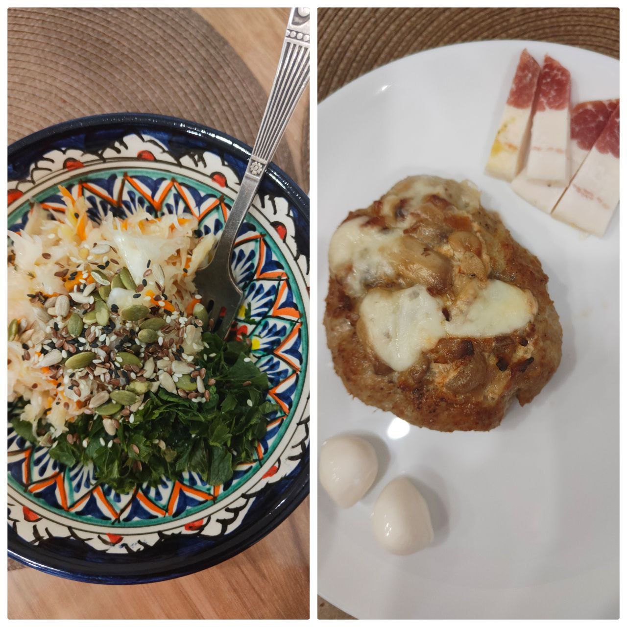 ОМАД. кето бургер(свинина /говядина, внутри грибы, бекон, сливки), сверху 2 шарика сыра, грудинка и 2 шарика сыра. Салат:петрушка + кваш.капуста, семечки, масло оливковое. За 10 минут до приёма пищи: масло сыр + дрожжи. ЯУ после еды. + добавки