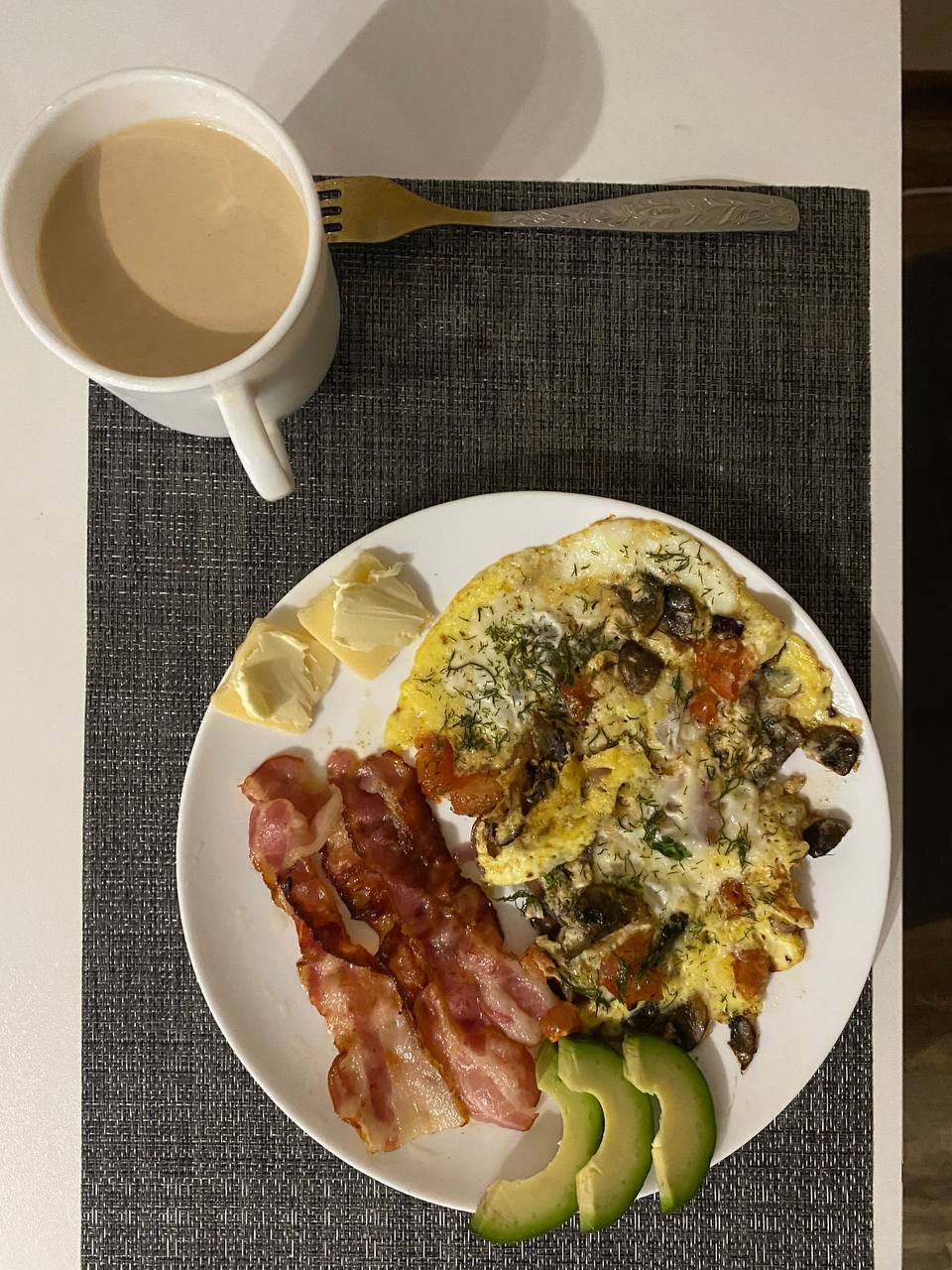 Здравствуйте! Завтрак: расторопша чайная ложка, уксус с минералкой, спустя 20 мину бекон 3 куска, яица 2 шт с шампиньонами, помидором, авокадо, сыр с маслом.
