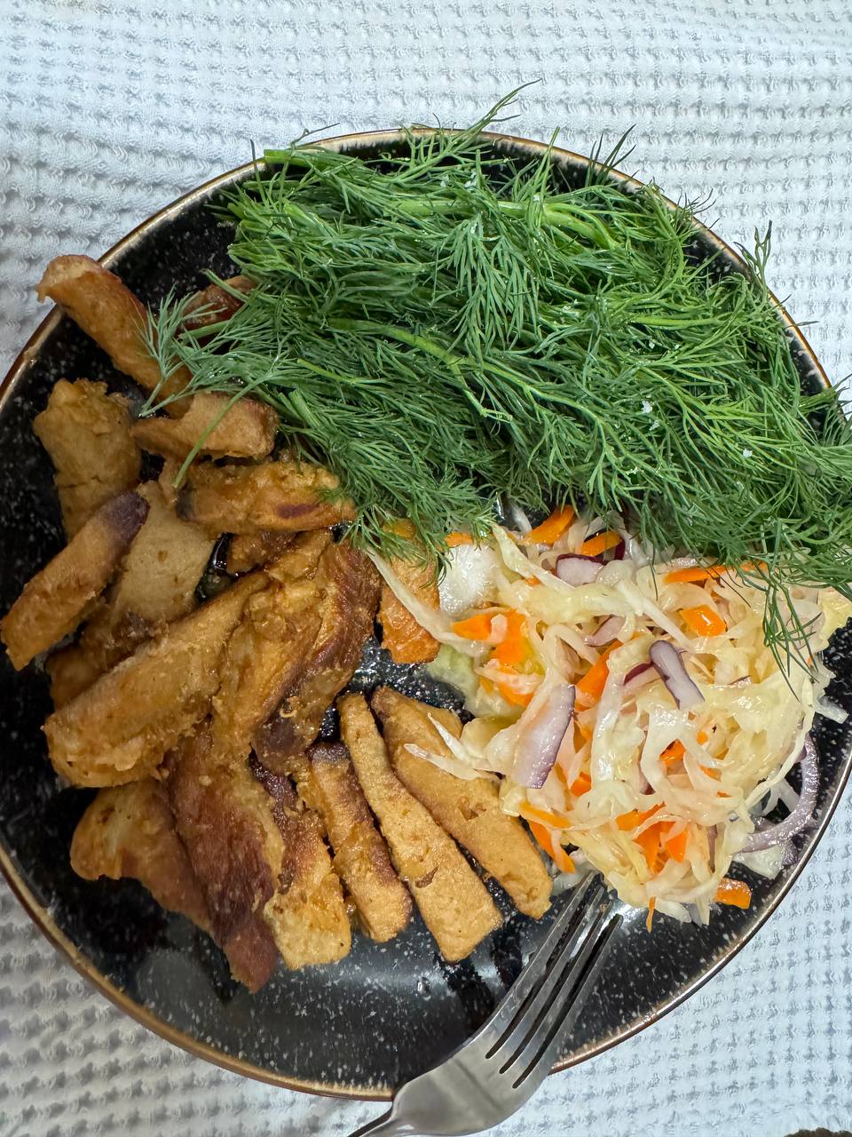 Мой сегодняшний прием пищи. Укус яблочный до и после еды. Натощак 2 ч.л расторопши. Обжаренная с луком свинина, квашеная капуста, пучок укропа, деревеная жирная сметана и деревенский жирный творог. Также принимаю бады КЗ.
