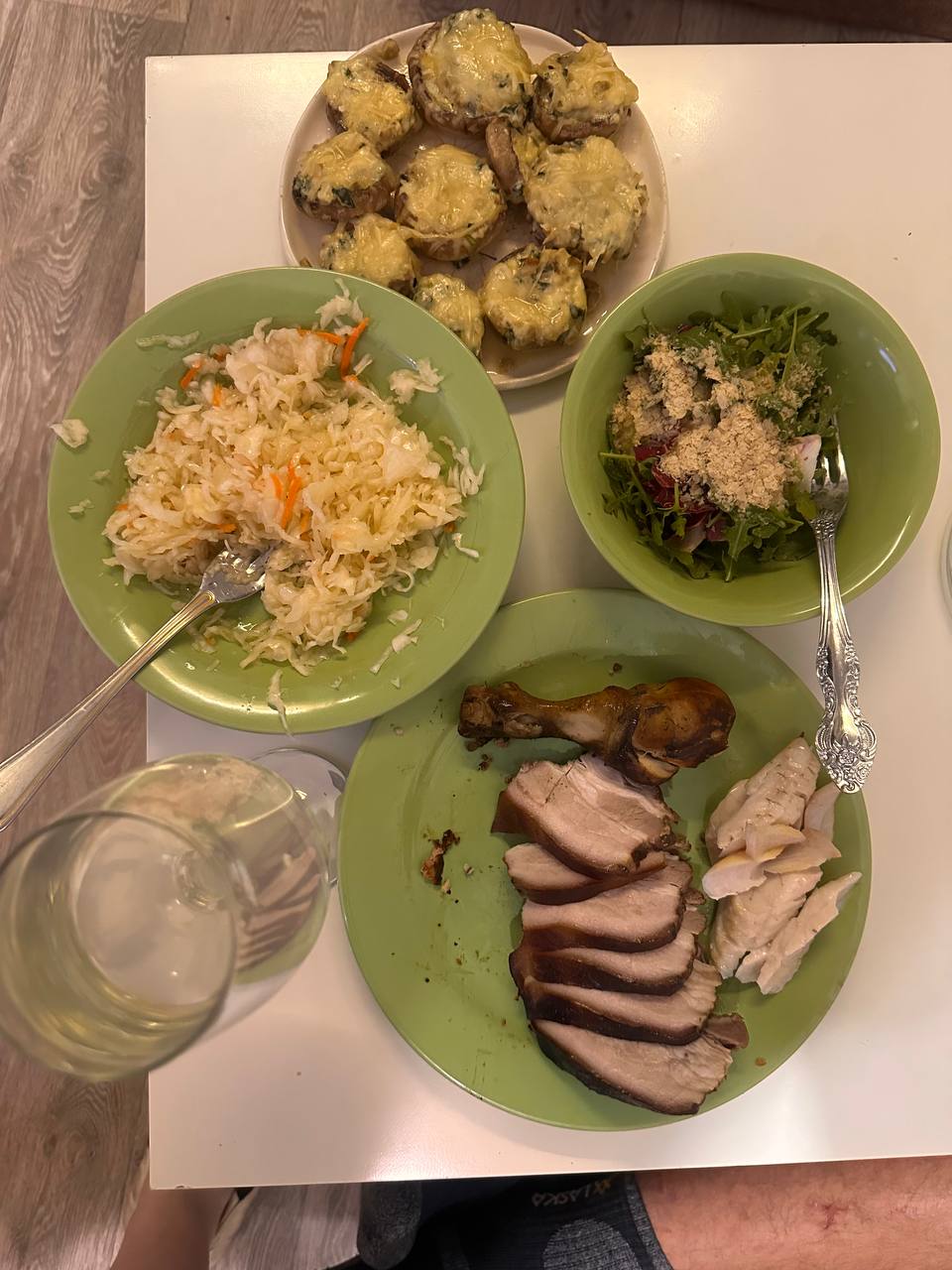 Первое фото ужин вчера (вчера скидывала другое фото на ужин, но пришлось изменить план и поэтому вчерашее фото оставила на первый прием на сегодня)на двоих с мужем, съели не всё! Копчёная грудина и нога курицы, капуста, зелень с дрожжами, шампиньоны по рецепту с марафона, в бокале минералка с яу. Утром кофе со сливками, первый прием кетобургер плюс креветки и салат капуста с зеленью, сегодня на ужин, остатки со вчерашнего ужина плюс пара кусков сыра пармезан. Добавки принимаю, в течение дня взяла Ессентуки 4 с кетошой и солью , 1 литр
