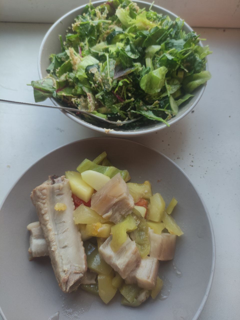 Здравствуйте! Сегодня будет два одинаковых приема пищи: зелень, огурец, пивные дрожжи. Основное: рёбрышки и грудинка тушёные+ кабачок, перец и помидорка.