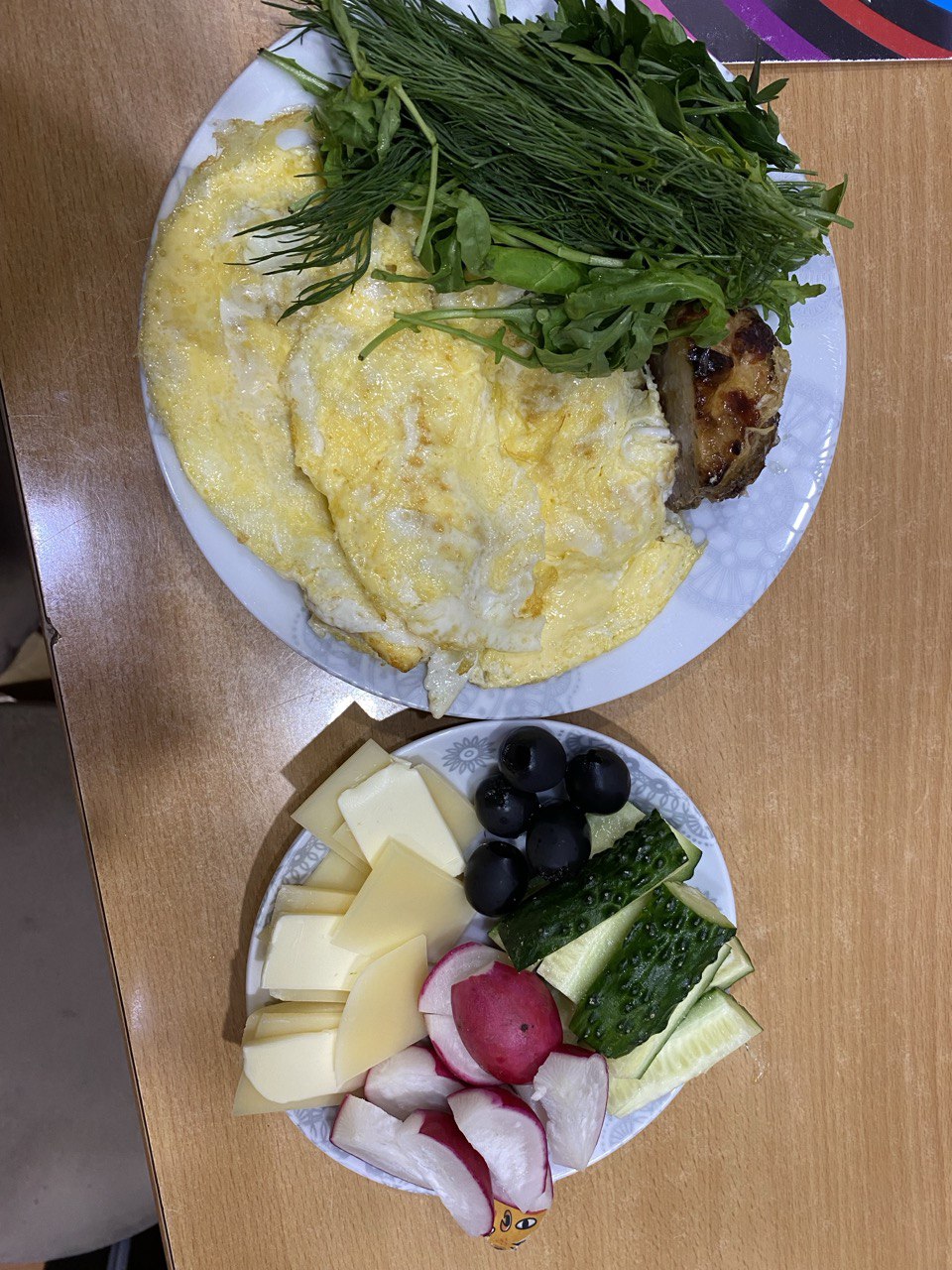 Первый пп-яичница из трех яиц на слив масле, половина кетобургера, один огурец, три редиски, разрешенные сыр с маслом, маслины, зелень .