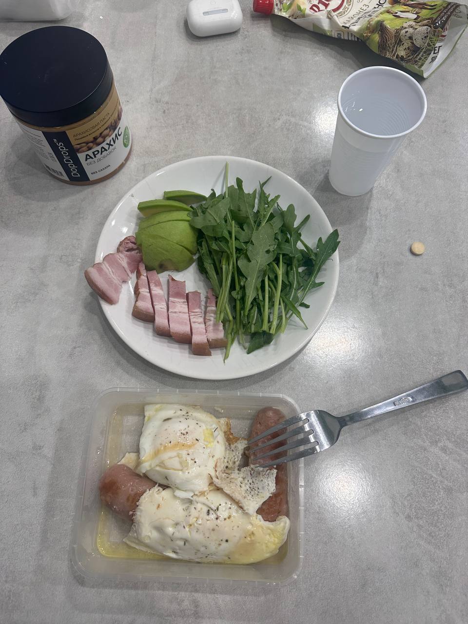 2 яйца, сарделька с хорошим составом на сливочном масле, грудинка, 1/4 авакадо, руккола, кофе черный, 1 ч.л пасты.