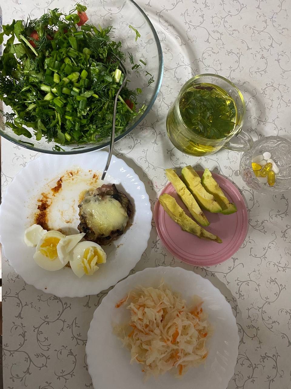 Кето бургер , яйцо авокадо . Салат из рукколы и 1 помидор . Капустка бады кето зона . Чай из мяты
