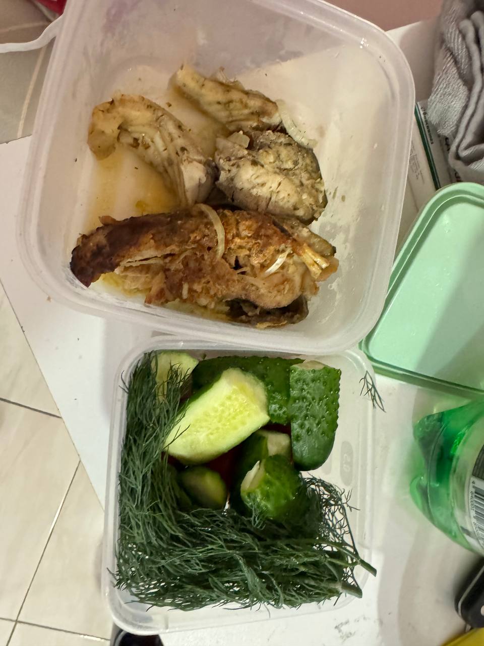 Рыба(карп ) с луком, помидор, огурцы, укроп, лимон еще был. Кофе со сливками . Сыр пармезан