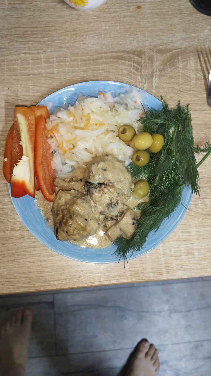 Тефтели (свинина говядина) в сливках с грибами и луком на сливочном масле