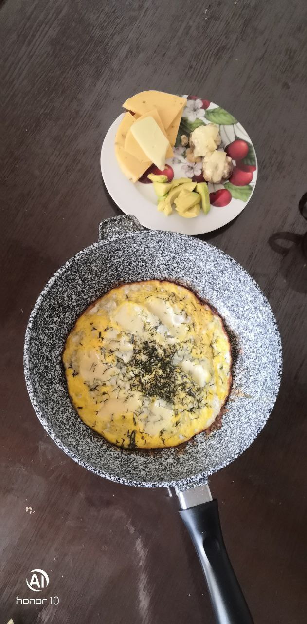 Завтрак яйца на сливочном масле, туда добавила сулугуни и Укроп. Плюс сыр, два шампиньона по рецепту и половина авокадо. Кофе со сливками.
