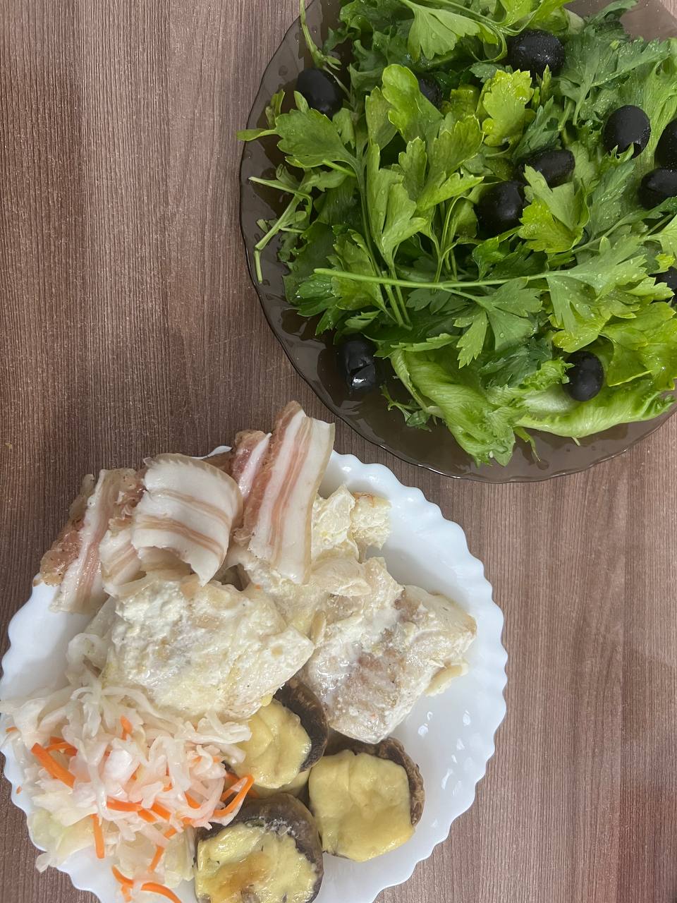 Белая рыба, залита сливками 33% и маслом гхи с сыром (сыр разрешенный, с канала), шампиньоны по рецепту из канала, капуста квашеная, сало