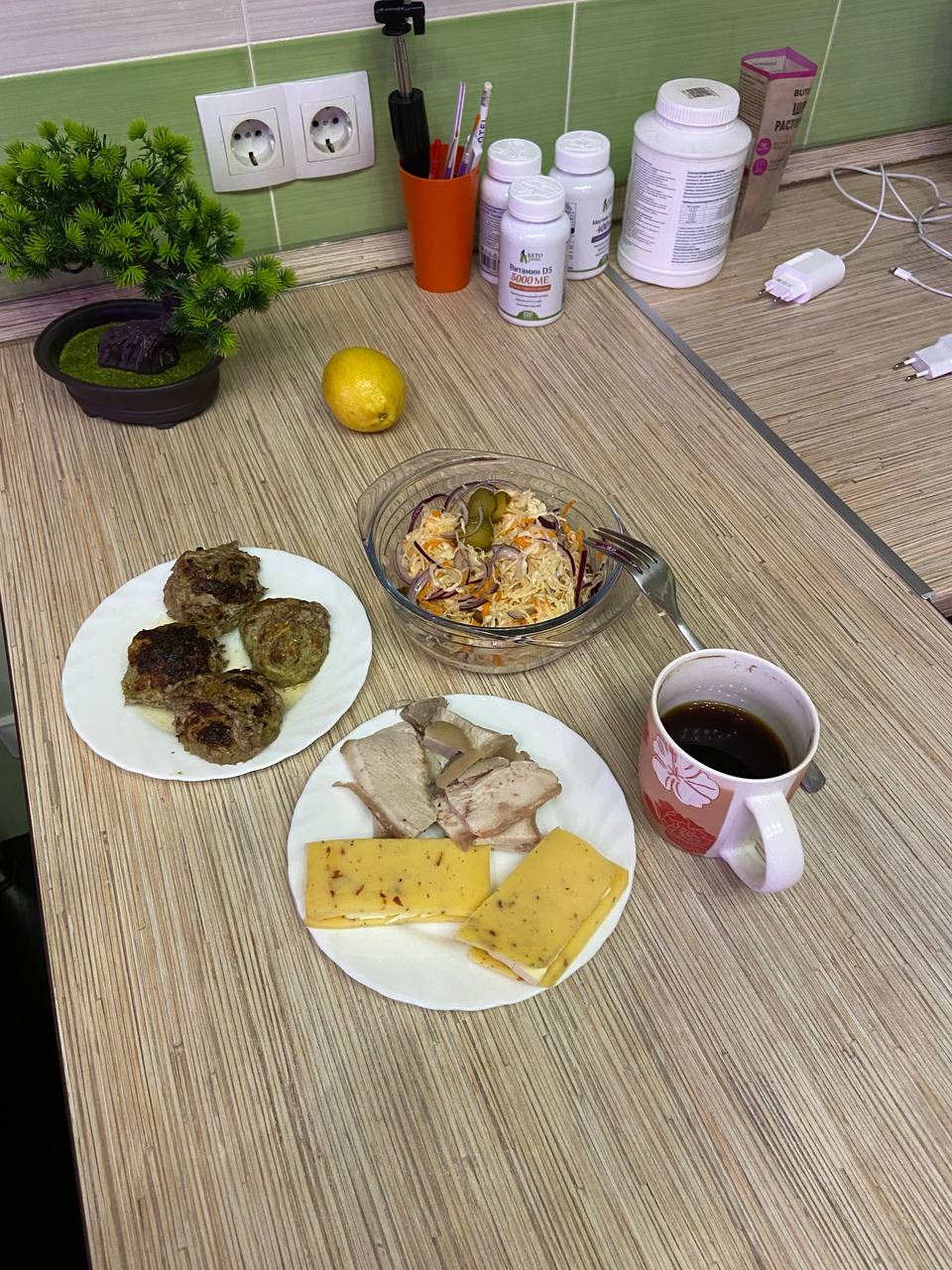 Котлеты фарш(говядина+свинина)+кабачок, салат из квашенной капусты+1 соленый огурец+0,5 красного лука и оливковое масло нерафинированное. Все соления и квашение делаю сама, без сахара. Добавки пью и воду с ЯУ в течение дня. В промежутках пью черный заварной кофе без добавок. Полет отличный)