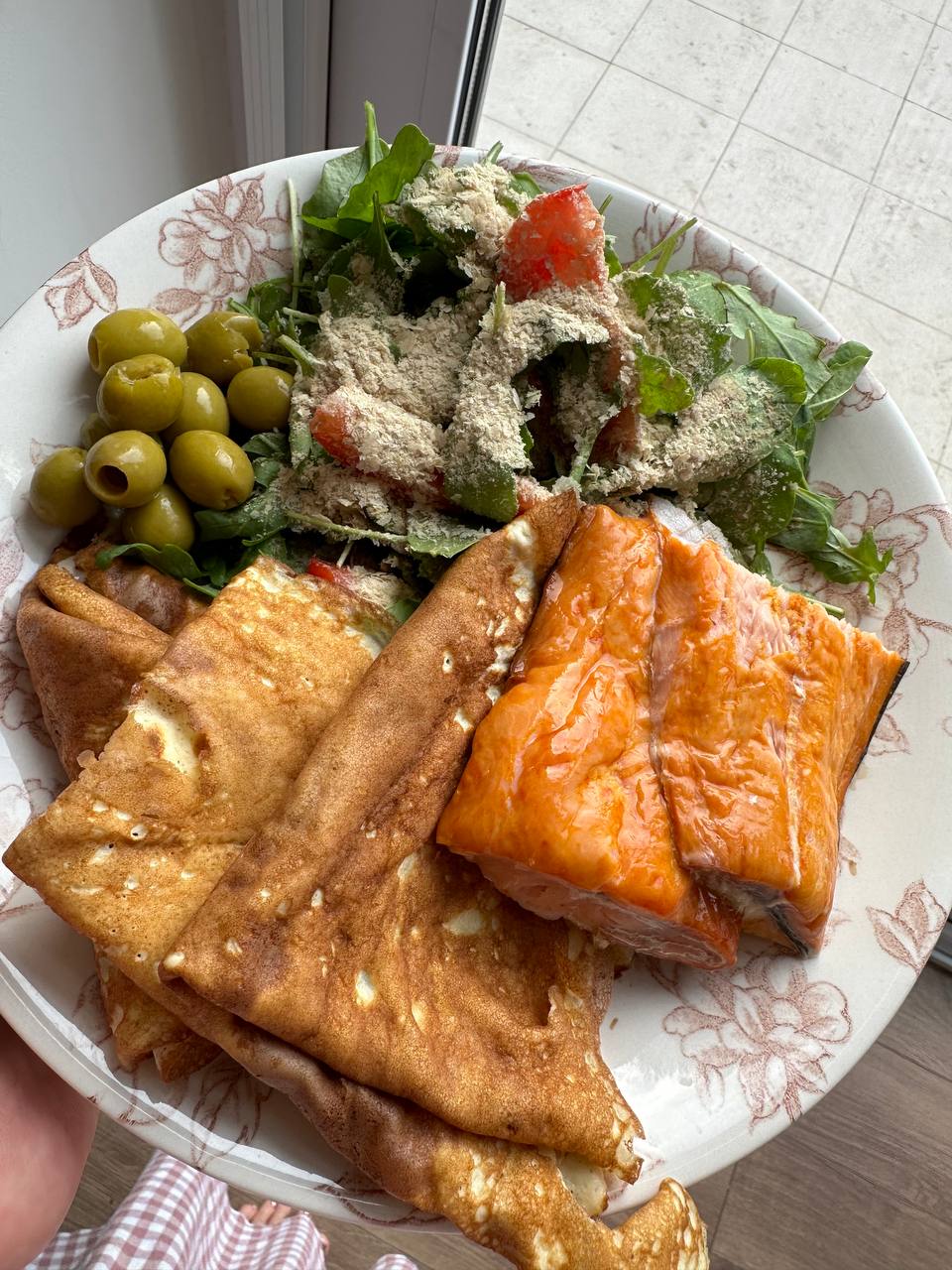 На завтрак: напекла кето-блинов по вашим рецептам, горбуша горячего , руккола с шампиньонами и пищевыми дрожжами, оливки , пол помидорки.