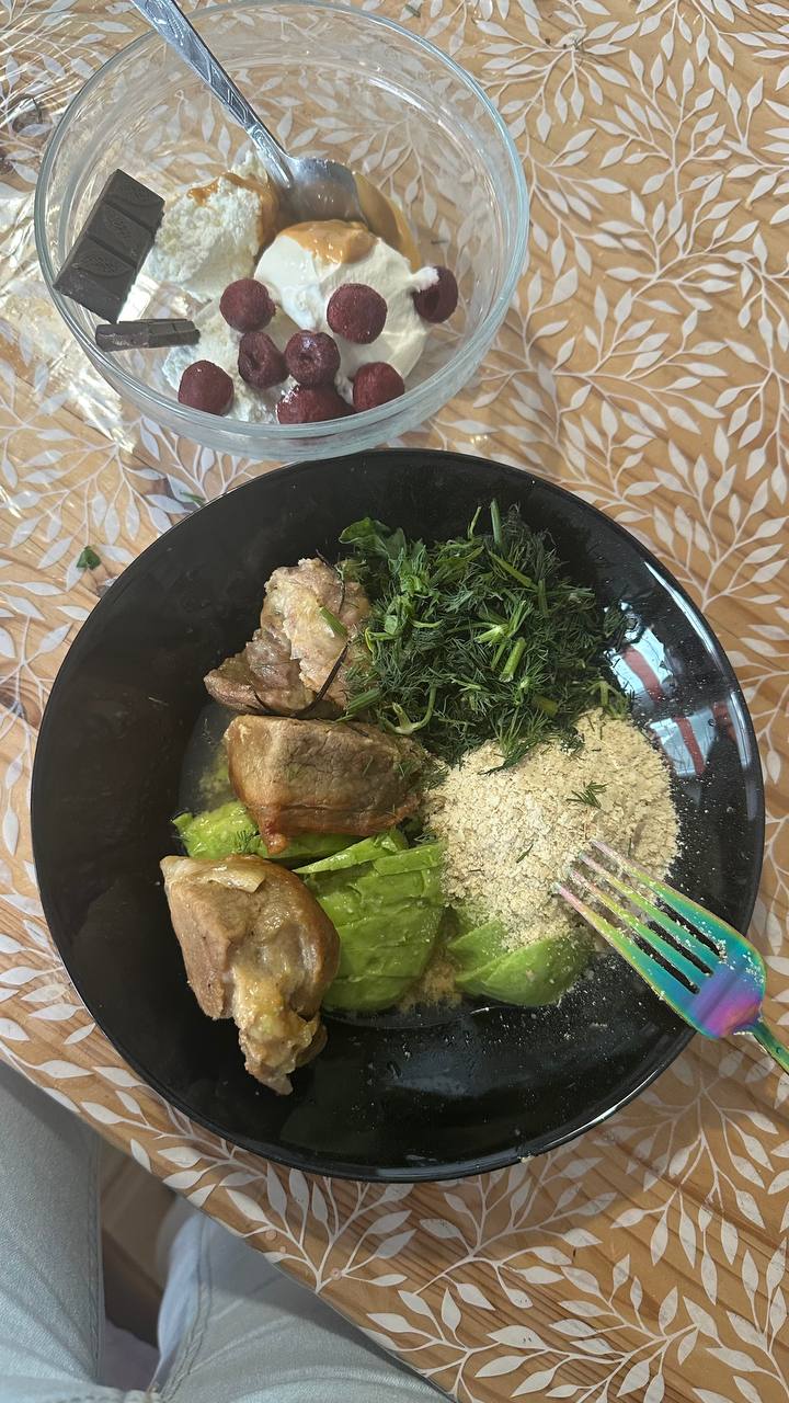 Свинина запеченая (доела наконец😅), авокадо целое, зелень, сулугуни 2 кусочка (на фото отсутствует, забыла). Десерт - творог 18%, Сметана 30%, арахисовая паста ложка, вишня замороженная и 4 квадратика шоколада